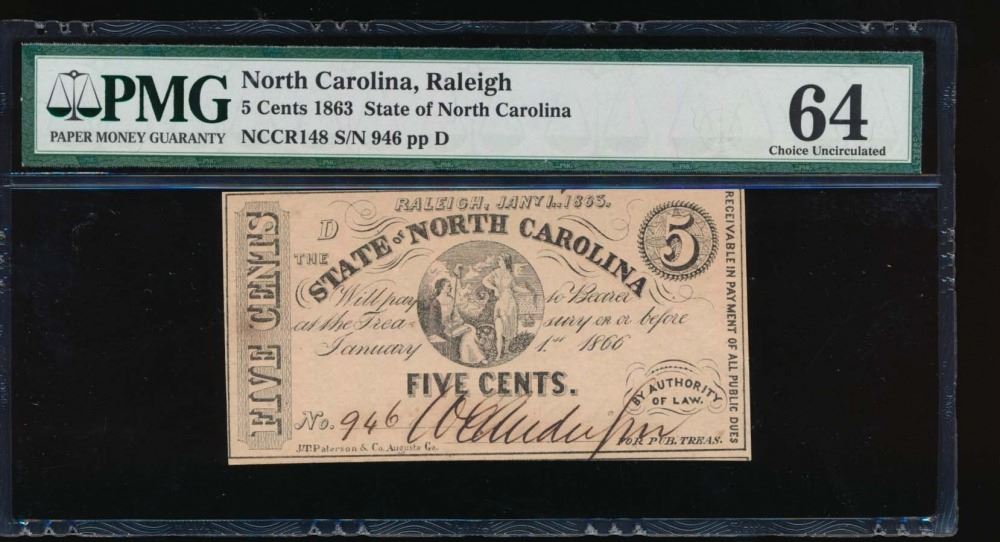 One 1863 Five Cent North Carolina Obsolete Note PMG 64.