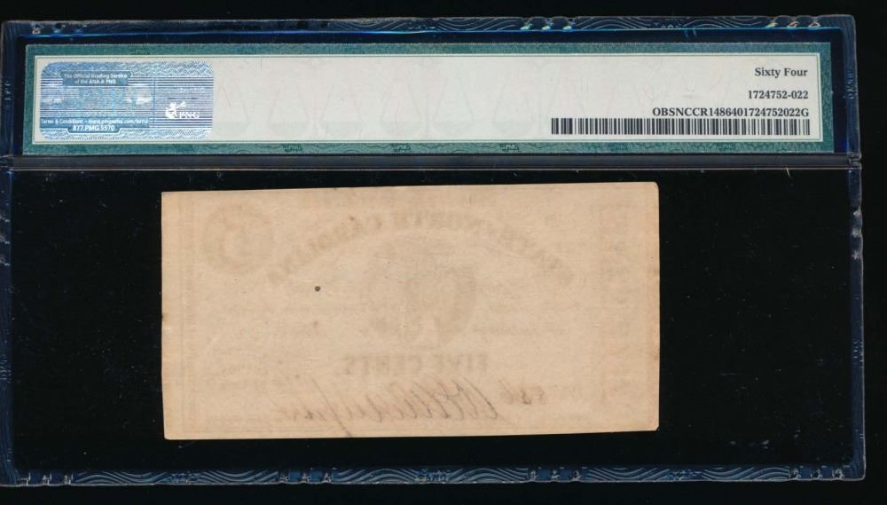 One 1863 Five Cent Raleigh NC Obsolete Note PMG 64.