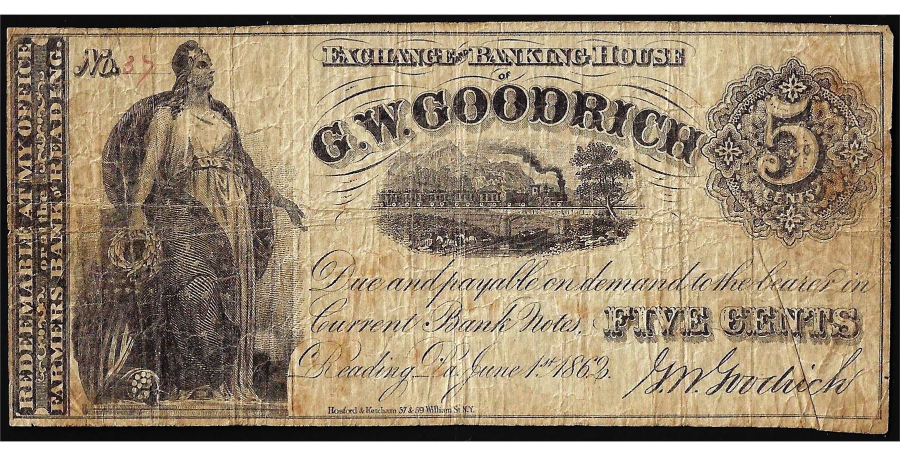 One 1863 Five Cents Exchange and Banking House of G.W. Reading, PA Obsolete Note.