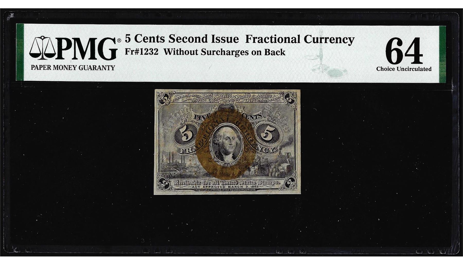 One 1863 Five Cents Second Issue Fractional Note Fr.1232 PMG Choice Uncirculated 64. PMG Certified.