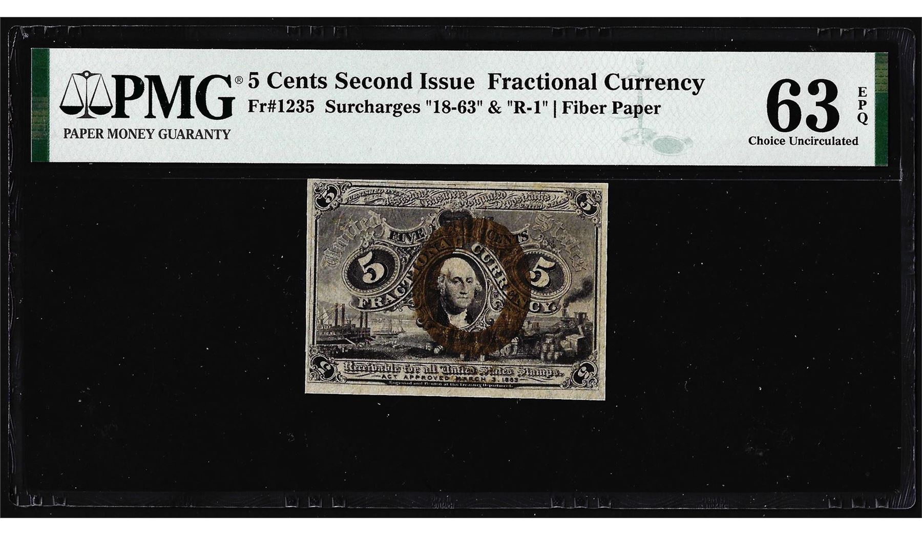 One 1863 Five Cents Second Issue Fractional Note Fr.1235 PMG Choice Uncirculated 63EPQ. PMG Certified.