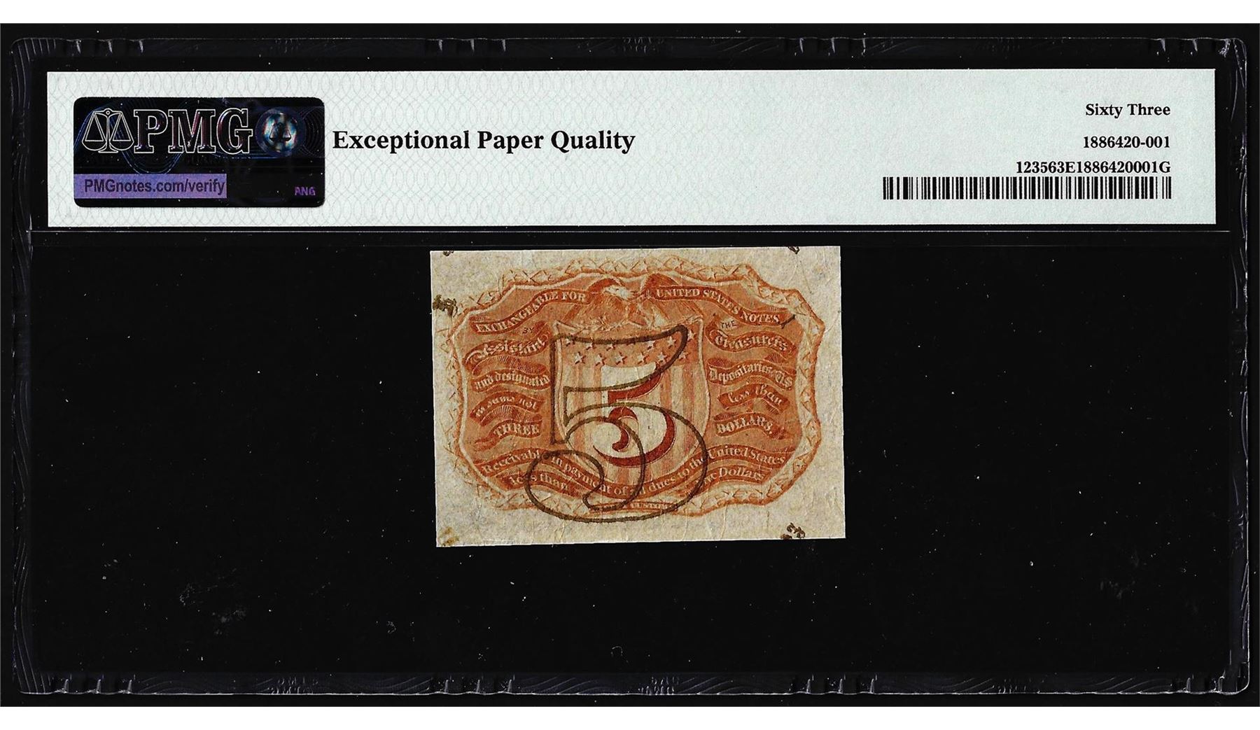 One 1863 Five Cents Second Issue Fractional Note Fr.1235 PMG Choice Uncirculated 63EPQ. PMG Certified.