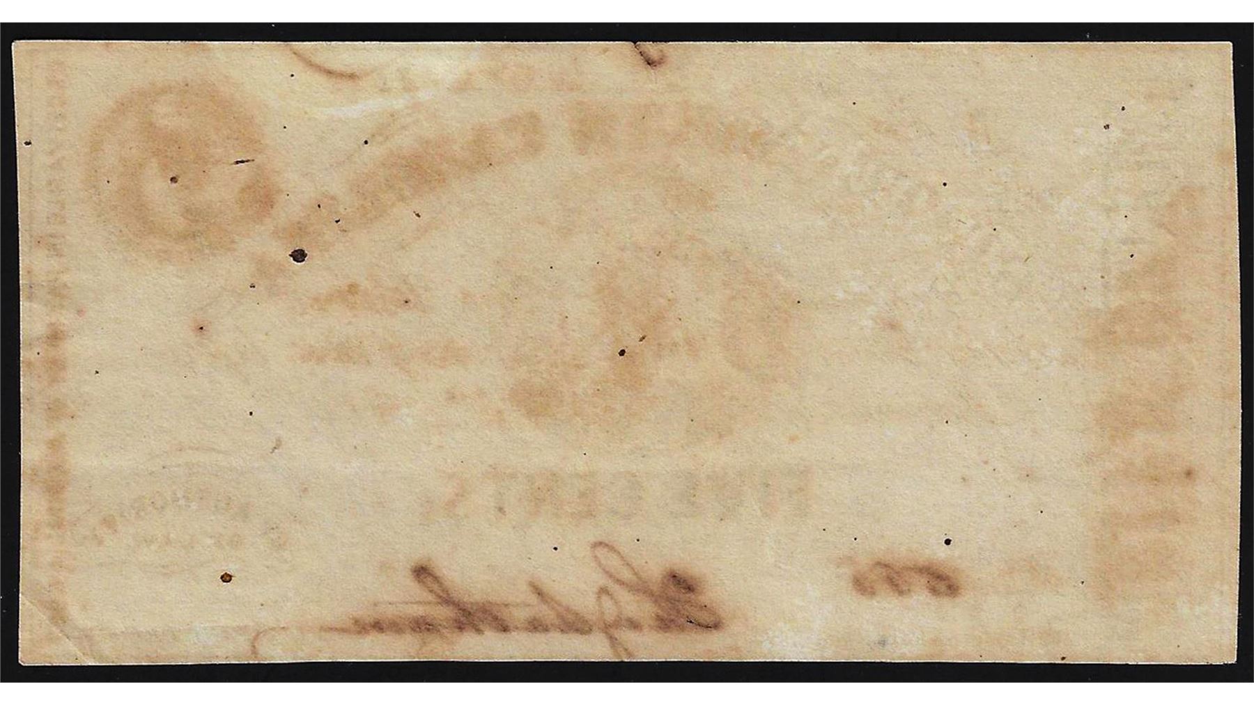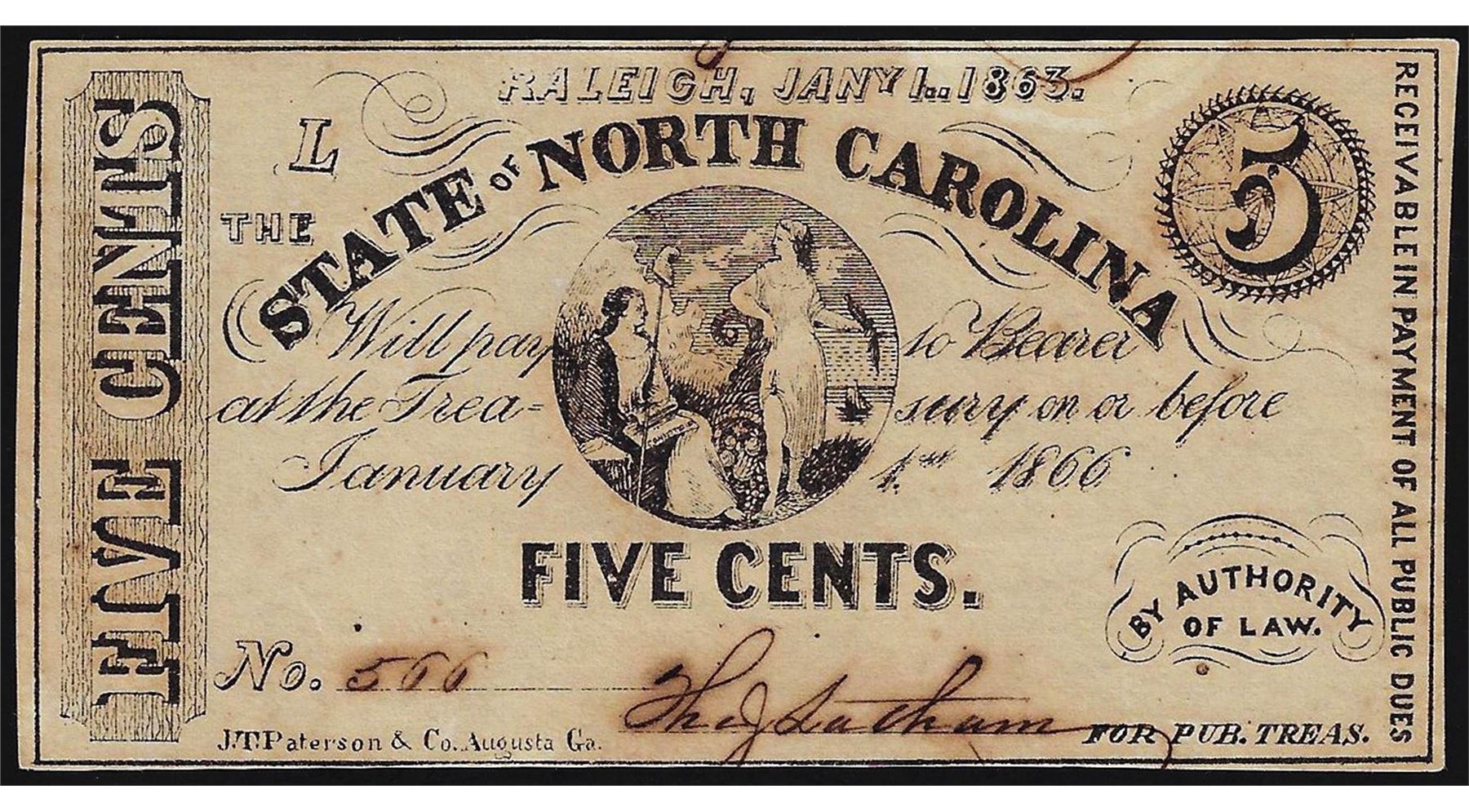 One 1863 Five Cents State of North Carolina Obsolete Bank Note.