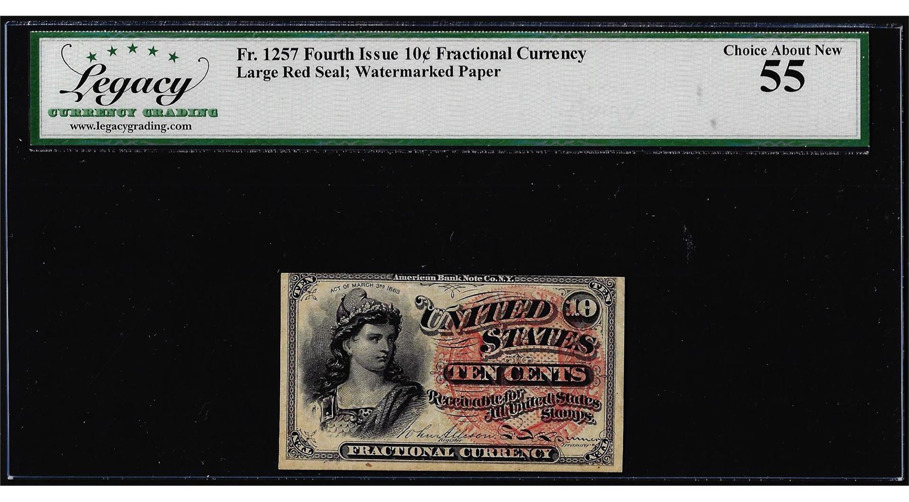 One 1863 Fourth Issue 10 Cent Fractional Currency Note Fr.1257 Legacy Choice About New 55. Legacy Graded.