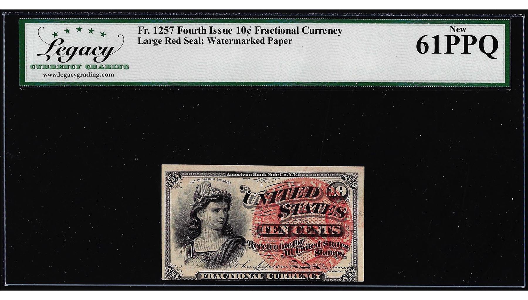 One 1863 Fourth Issue 10 Cent Fractional Currency Note Fr.1257 Legacy New 61PPQ. Legacy Graded.