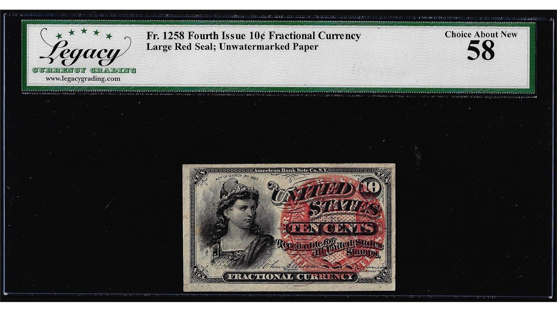 One 1863 Fourth Issue 10 Cent Fractional Currency Note Fr.1258 Legacy Choice About New 58. Legacy Graded.