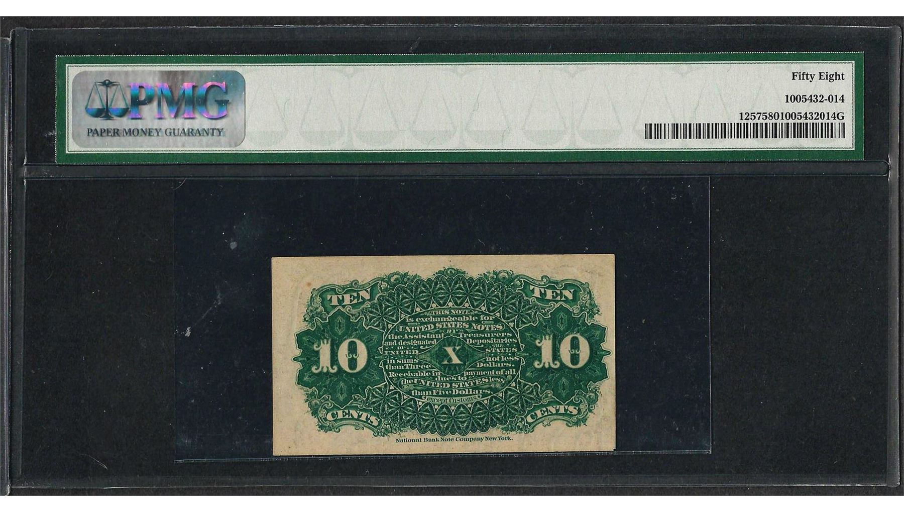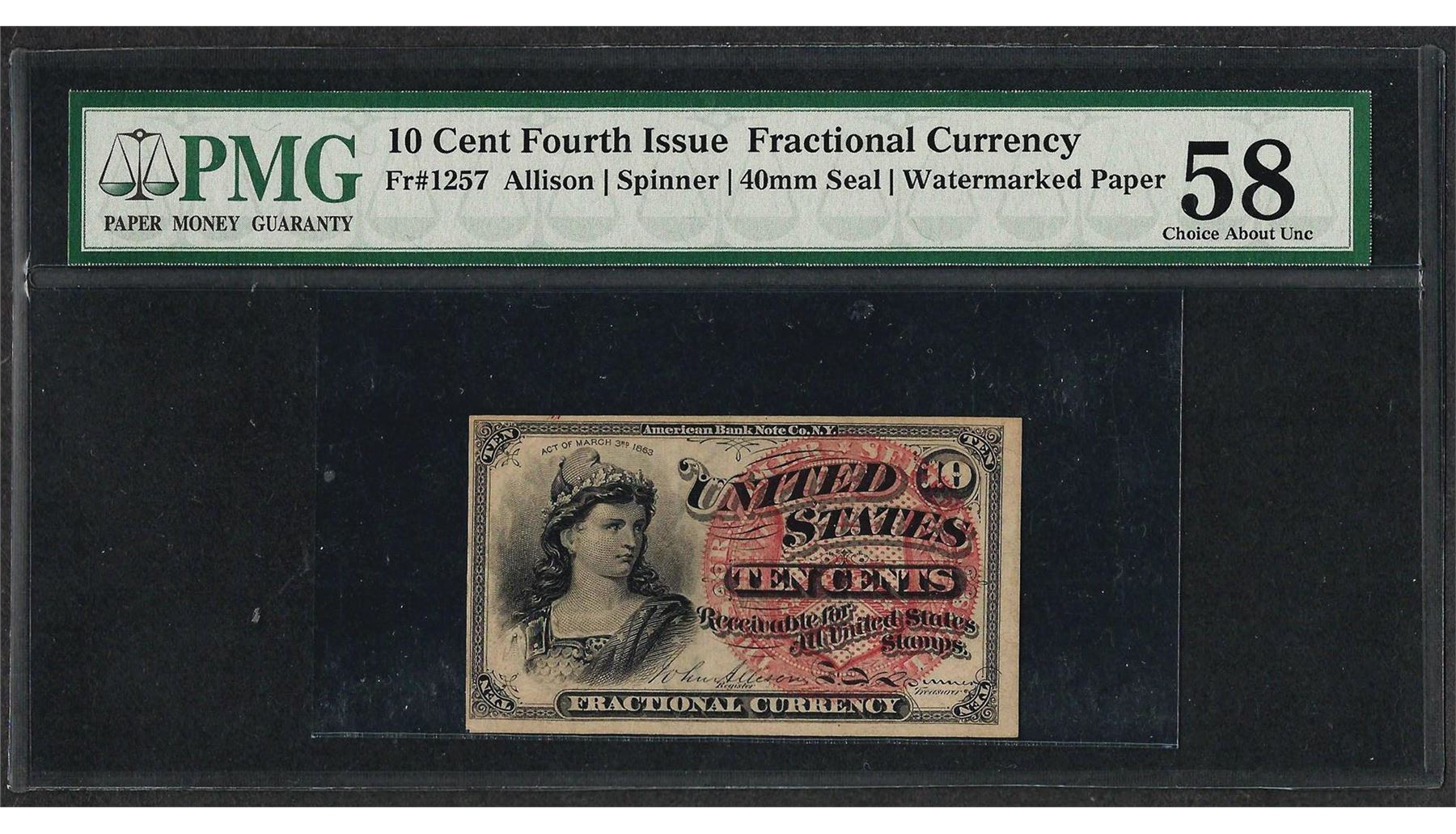 One 1863 Fourth Issue 10 Cent Fractional Currency Note PMG Choice About Uncirculated 58. PMG Certified.