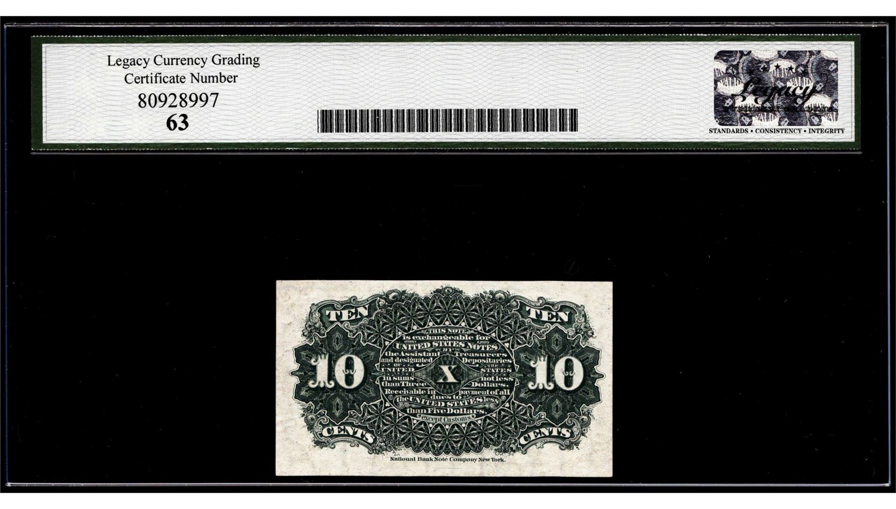 One 1863 Fourth Issue 10 Cents Fractional Currency Note Fr.1257 Legacy Choice New 63. Legacy Graded.