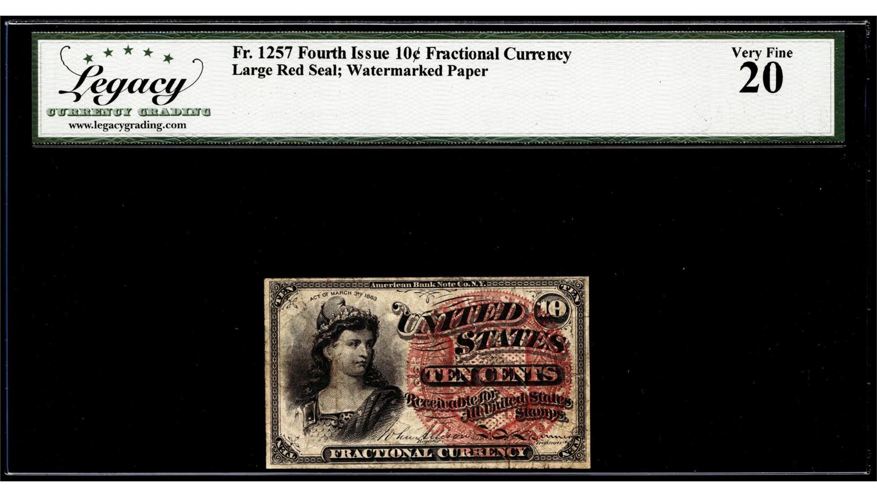 One 1863 Fourth Issue 10 Cents Fractional Currency Note Fr.1258 Legacy Very Fine 20. Legacy Graded.