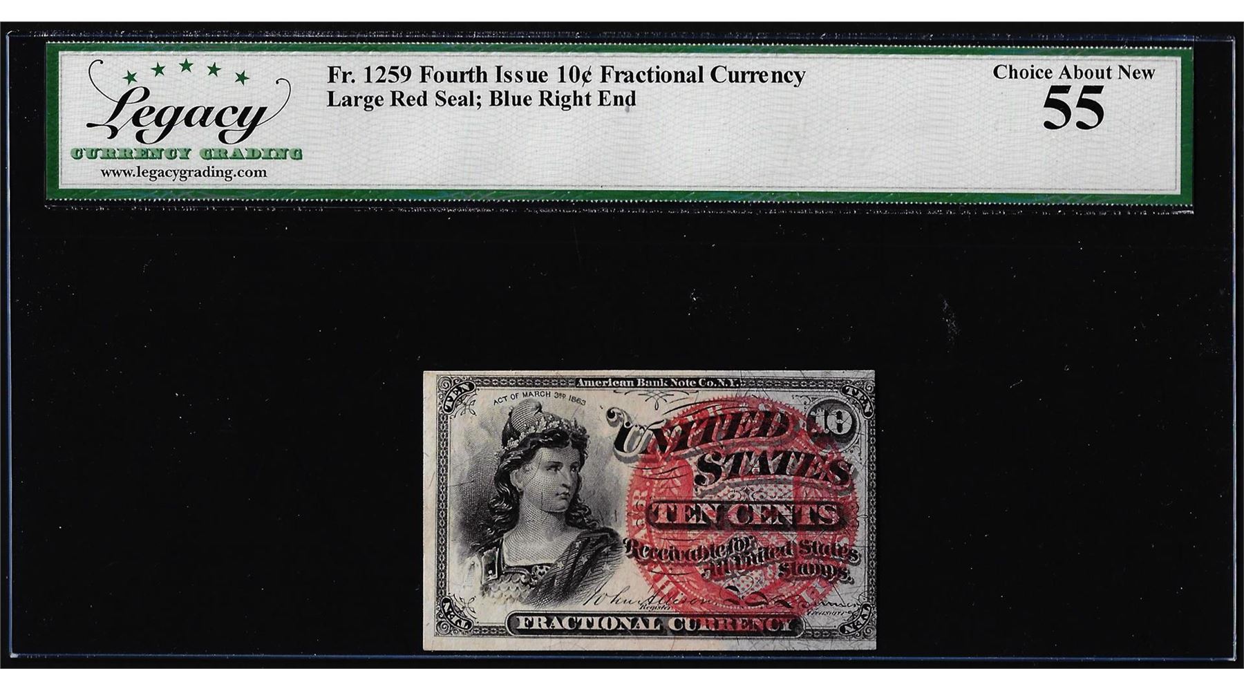 One 1863 Fourth Issue 10 Cents Fractional Currency Note Fr.1259 Legacy Choice About New 55. Legacy Graded.