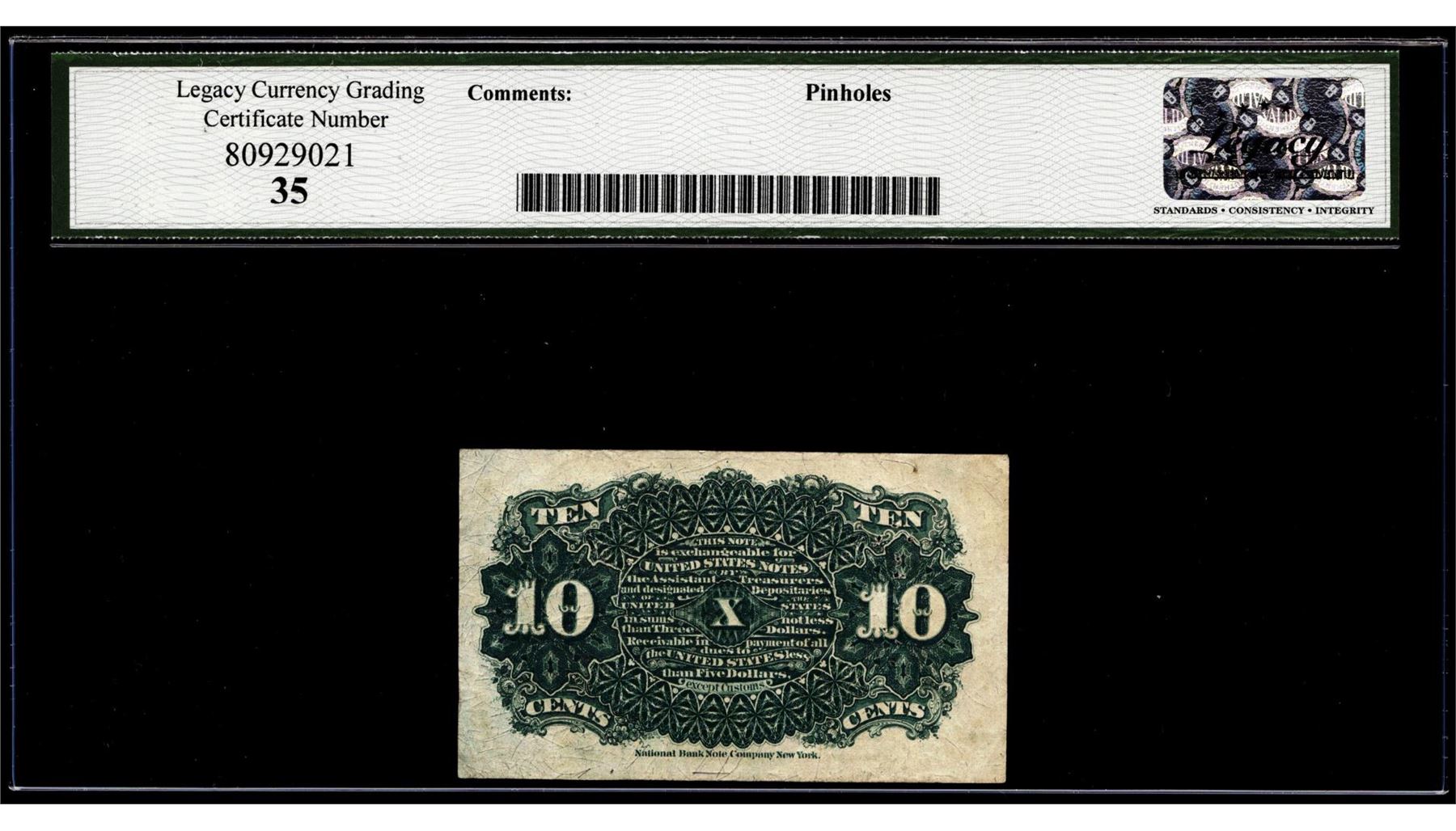 One 1863 Fourth Issue 10 Cents Fractional Currency Note Fr.1259 Legacy Very Fine 35. Legacy Graded.