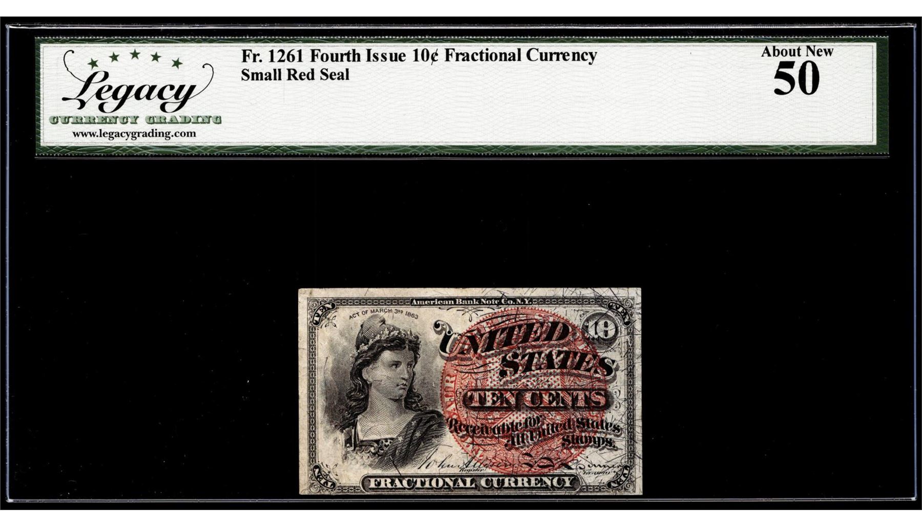 One 1863 Fourth Issue 10 Cents Fractional Currency Note Fr.1261 Legacy About New 50. Legacy Graded.