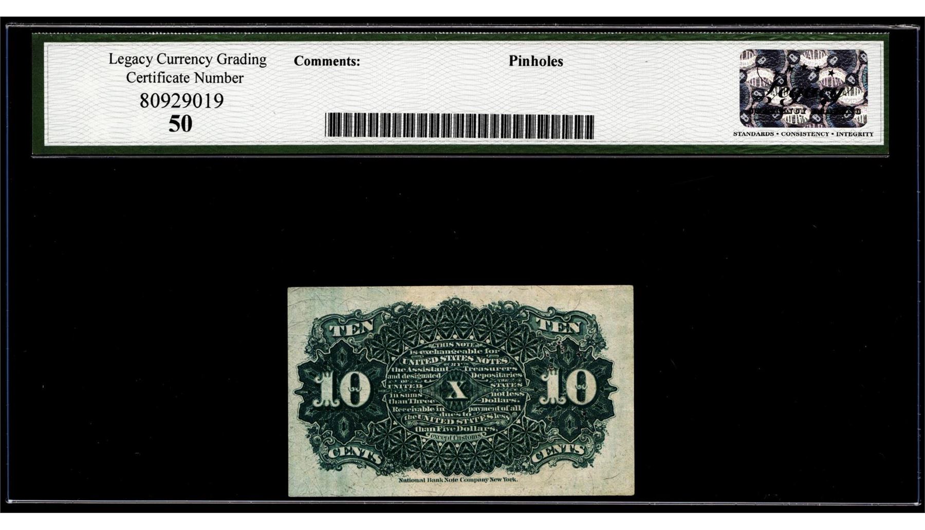 One 1863 Fourth Issue 10 Cents Fractional Currency Note Fr.1261 Legacy About New 50. Legacy Graded.