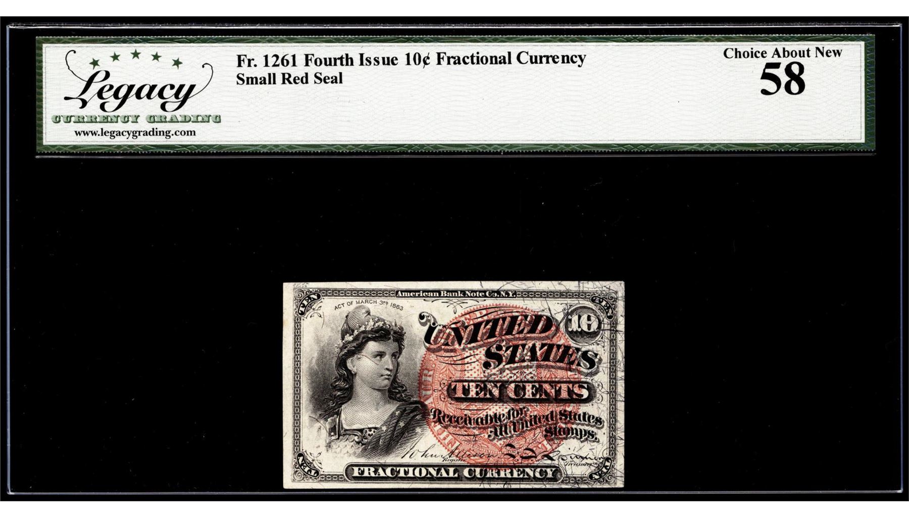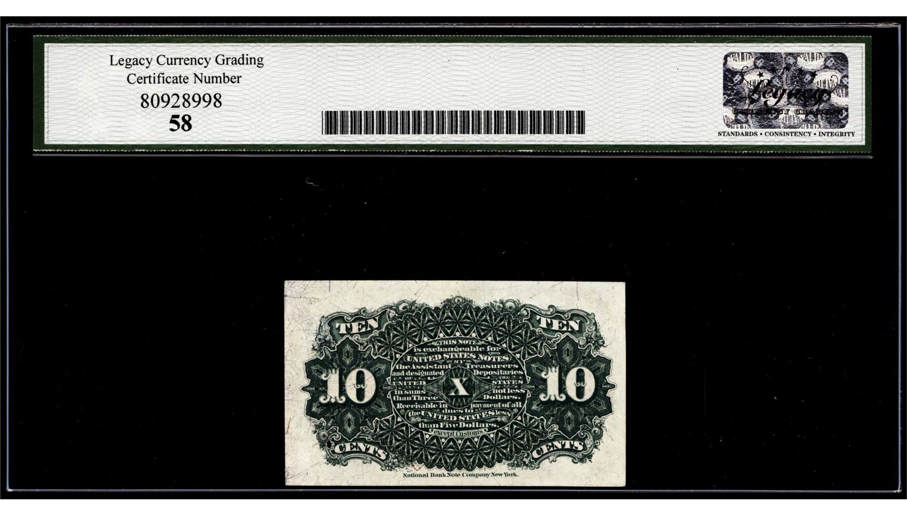 One 1863 Fourth Issue 10 Cents Fractional Currency Note Fr.1261 Legacy Ch. About New 58. Legacy Graded.
