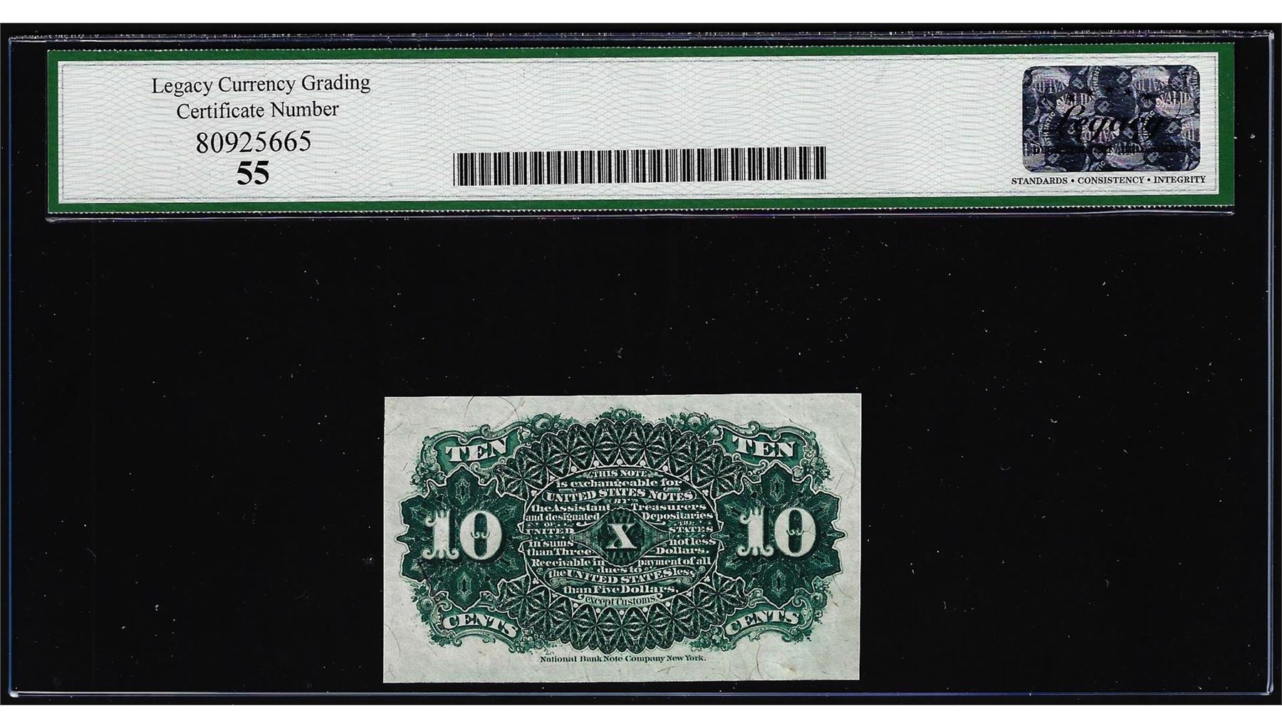 One 1863 Fourth Issue 10 Cents Fractional Note Fr.1257 Legacy Choice About New 55. Legacy Graded.