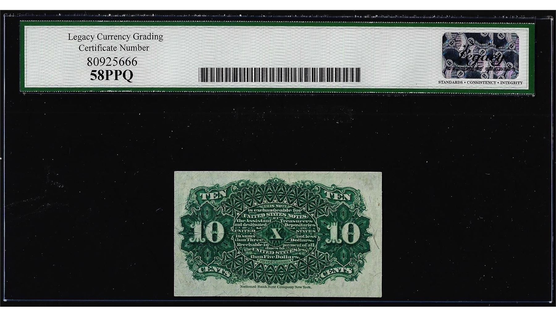 One 1863 Fourth Issue 10 Cents Fractional Note Fr.1261 Legacy Choice About New 58PPQ. Legacy Graded.