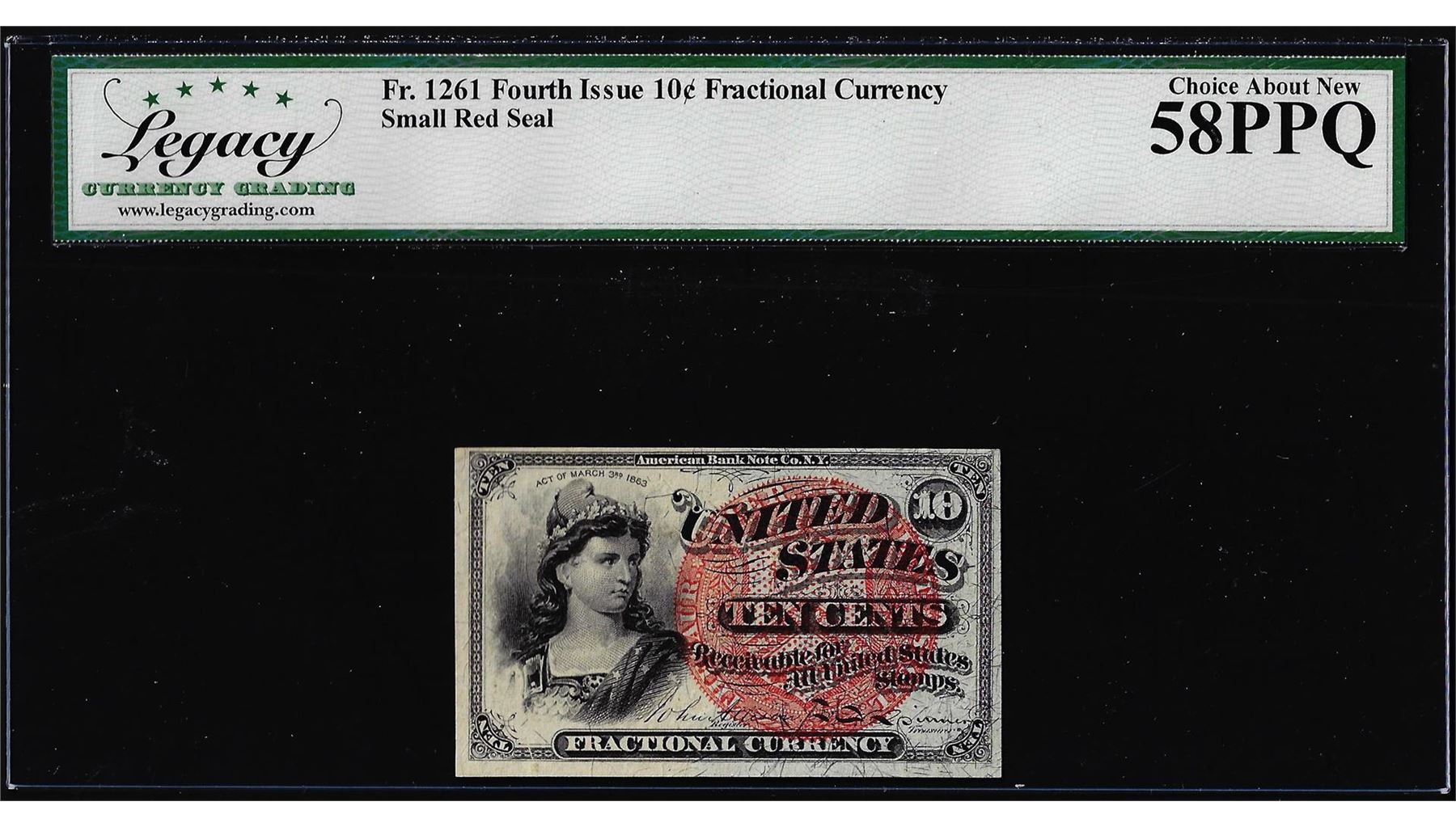 One 1863 Fourth Issue 10 Cents Fractional Note Fr.1261 Legacy Choice About New 58PPQ. Legacy Graded.