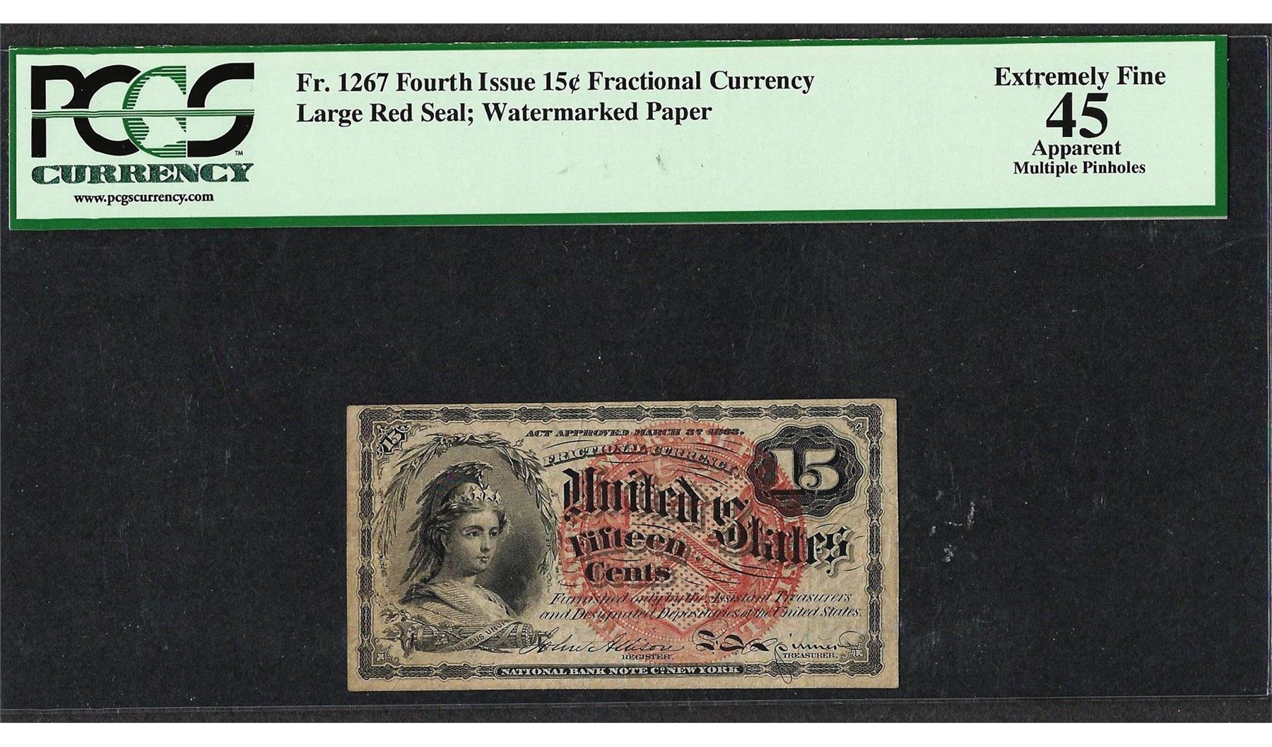 One 1863 Fourth Issue 15 Cent Fractional Currency Note PCGS Extremely Fine 45 Apparent. PCGS Graded.