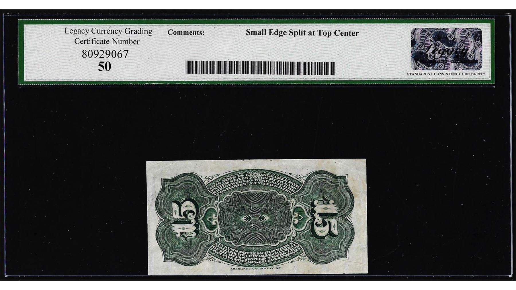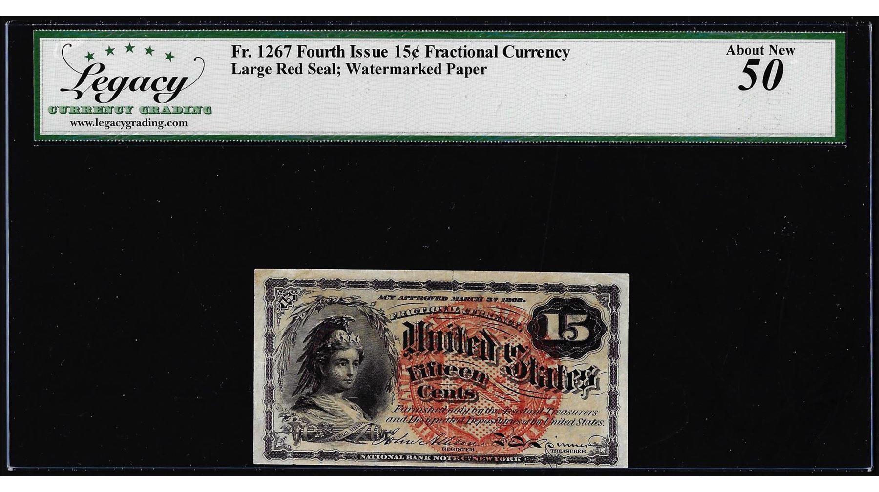 One 1863 Fourth Issue 15 Cents Fractional Currency Note Fr.1267 Legacy About New 50. Legacy Graded.