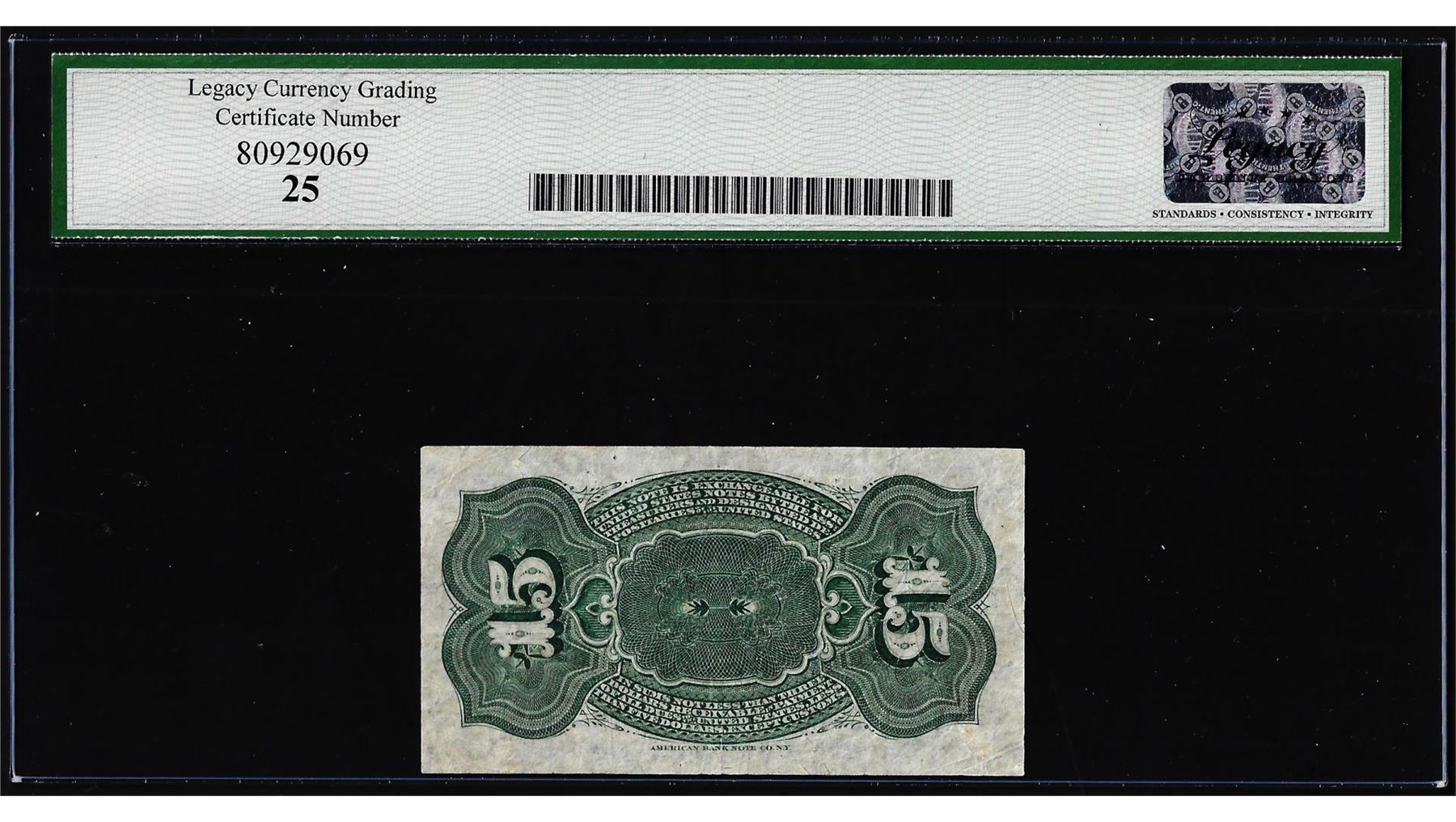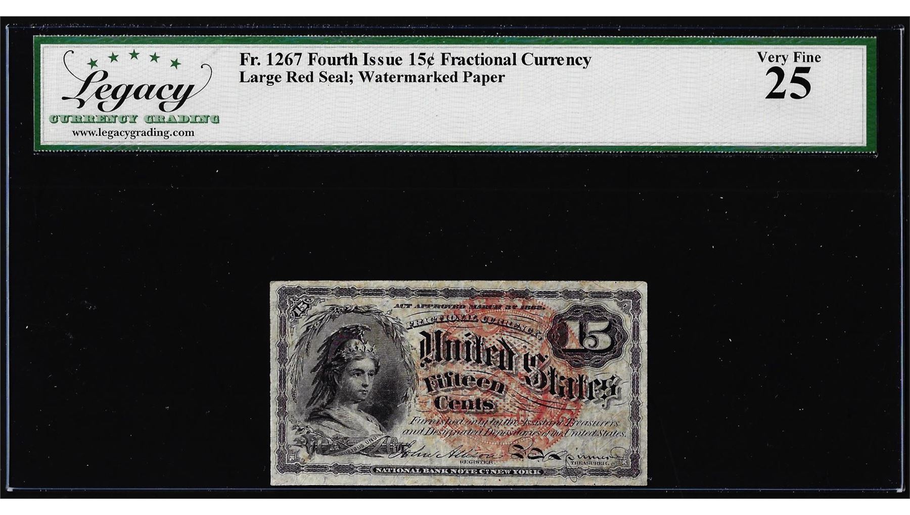 One 1863 Fourth Issue 15 Cents Fractional Currency Note Fr.1267 Legacy Very Fine 25. Legacy Graded.