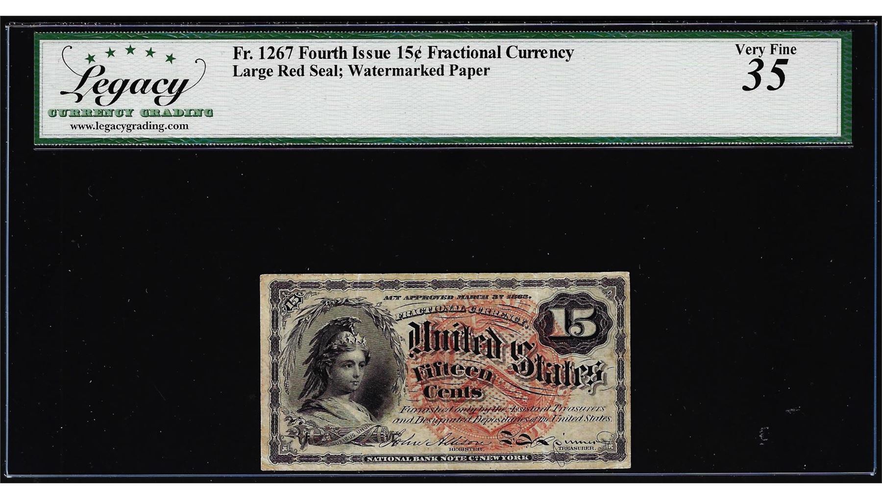 One 1863 Fourth Issue 15 Cents Fractional Currency Note Fr.1267 Legacy Very Fine 35. Legacy Graded.