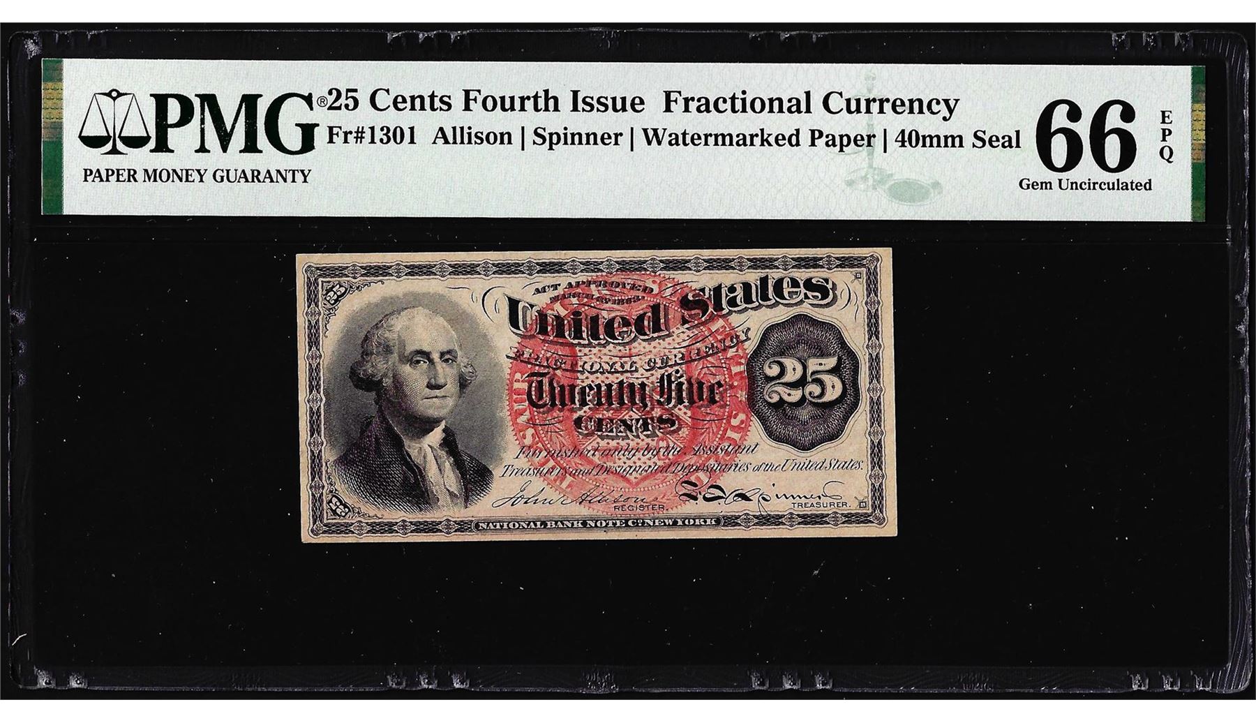 One 1863 Fourth Issue 25 Cent Fractional Currency Note Fr.1301 PMG Gem Uncirculated 66EPQ. PMG Certified.
