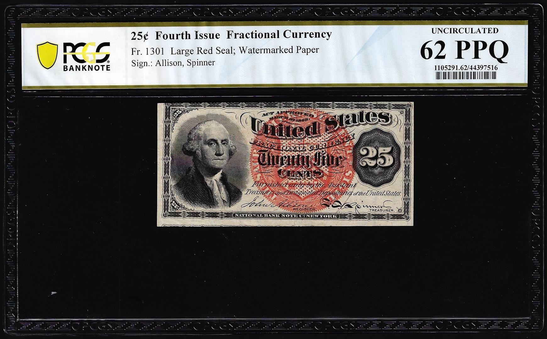 One 1863 Fourth Issue 25 Cents Fractional Currency Note Fr.1301 PCGS Uncirculated 62PPQ. PCGS Graded.