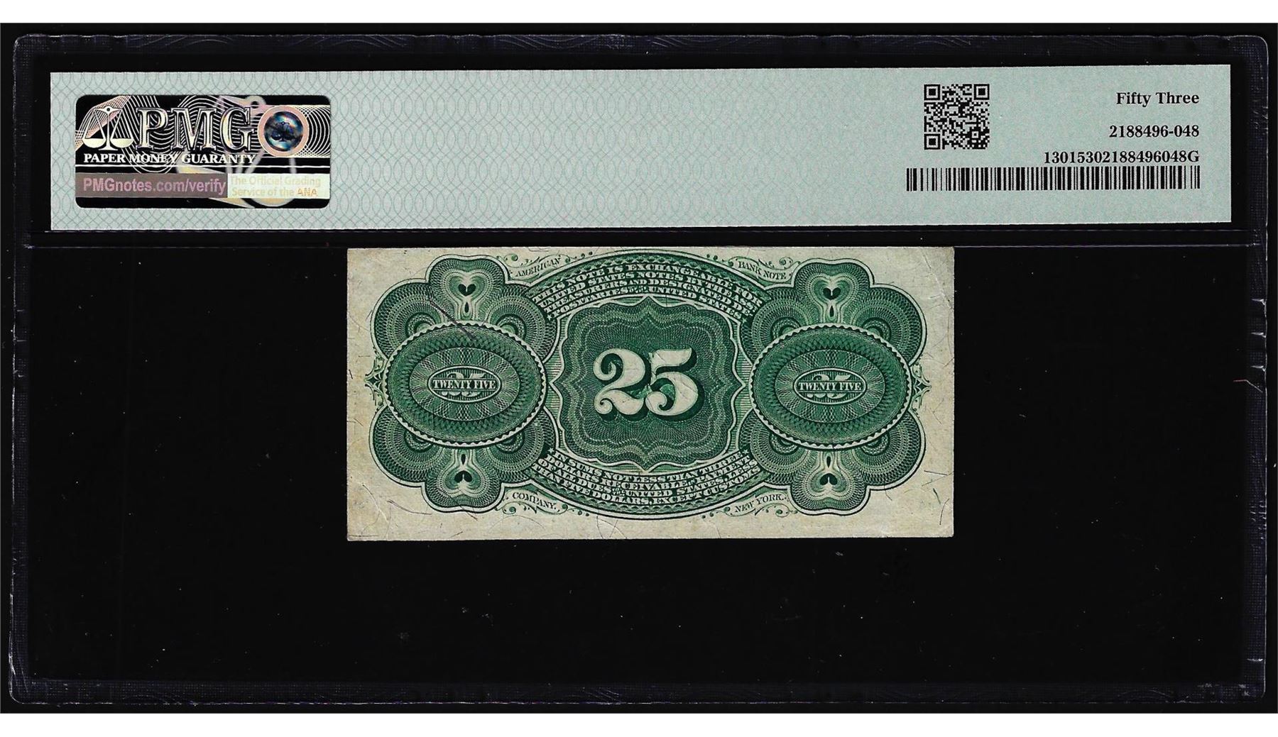 One 1863 Fourth Issue 25 Cents Fractional Currency Note Fr.1301 PMG About Uncirculated 53. PMG Certified.