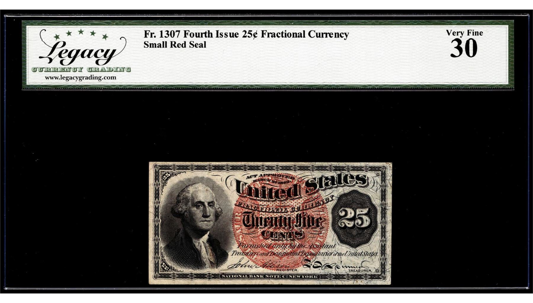 One 1863 Fourth Issue 25 Cents Fractional Currency Note Fr.1307 Legacy Very Fine 30. Legacy Graded.