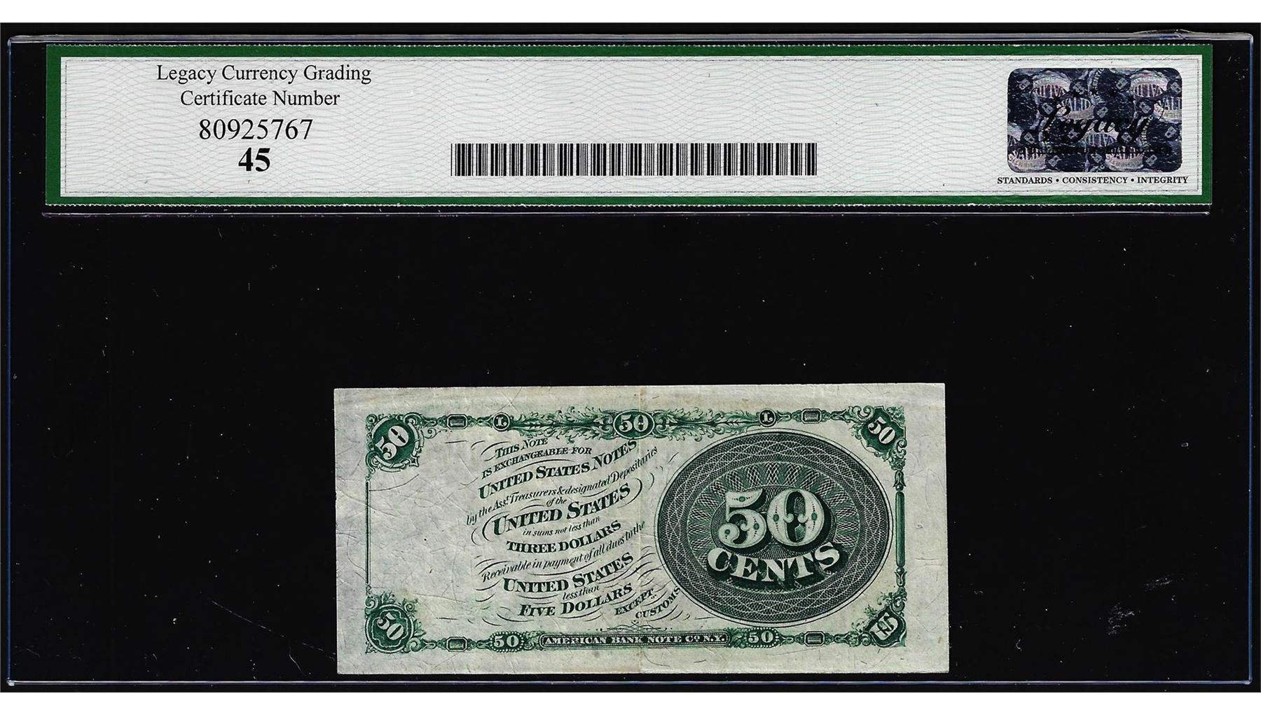 One 1863 Fourth Issue 50 Cent Fractional Currency Note Fr.1376 Legacy Extremely Fine 45. Legacy Graded.