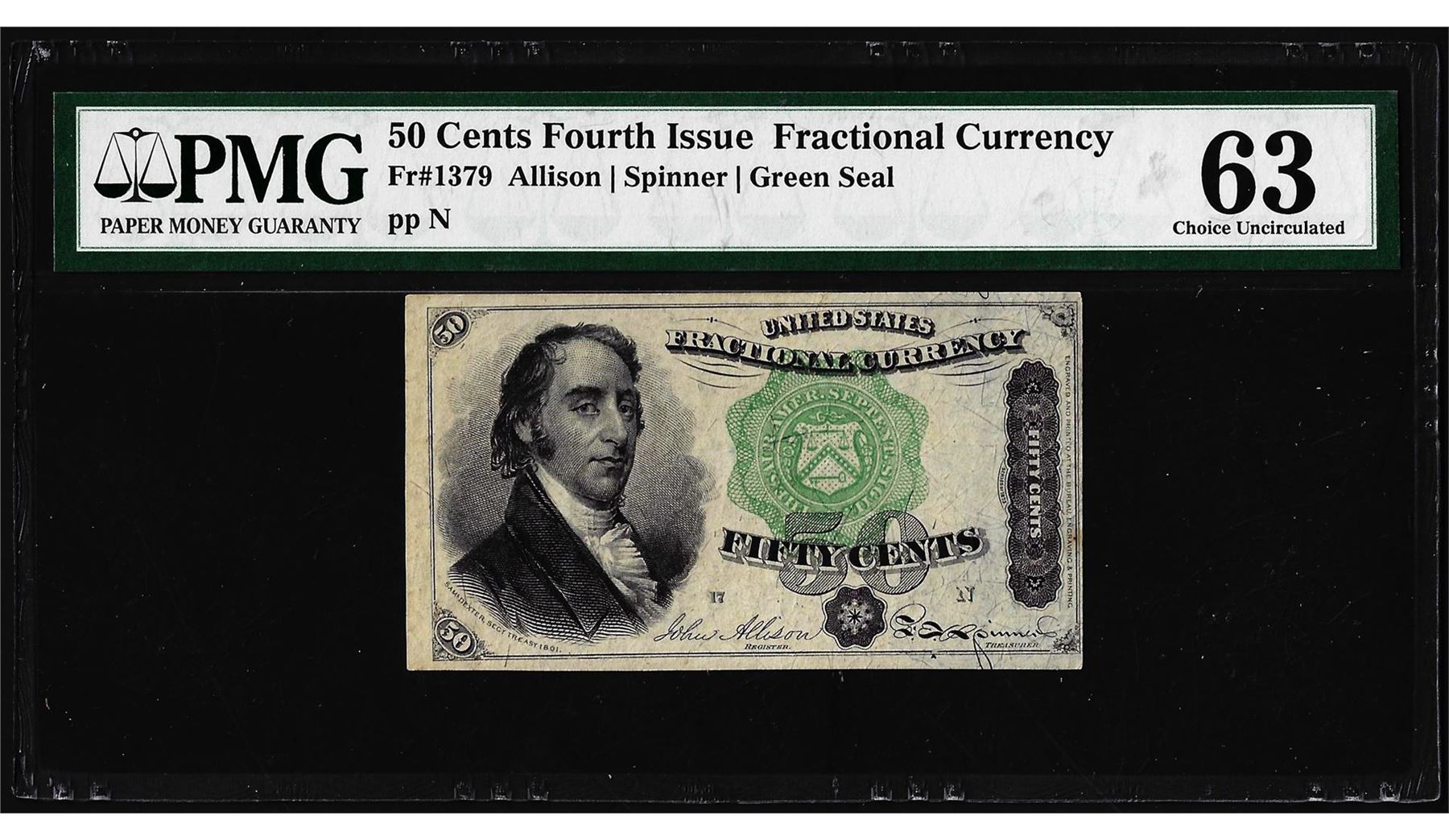 One 1863 Fourth Issue 50 Cent Fractional Currency Note Fr.1379 PMG Choice Uncirculated 63. PMG Certified.