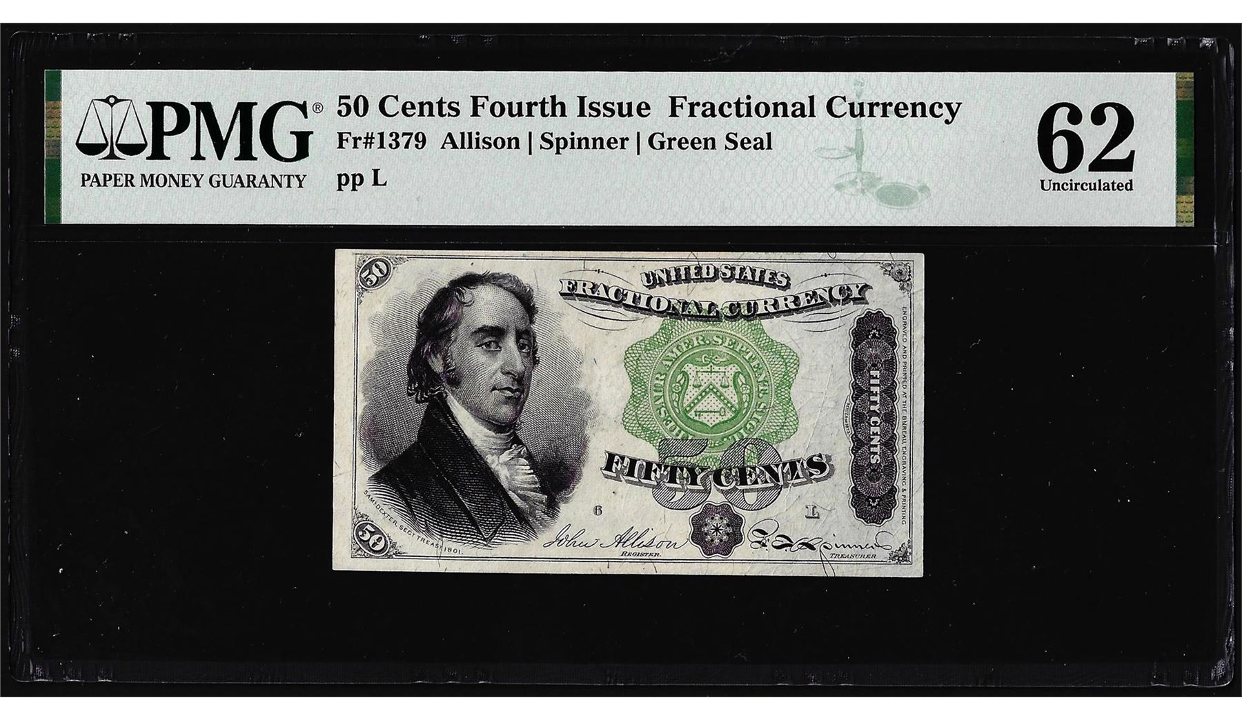One 1863 Fourth Issue 50 Cent Fractional Currency Note Fr.1379 PMG Uncirculated 62. PMG Certified.