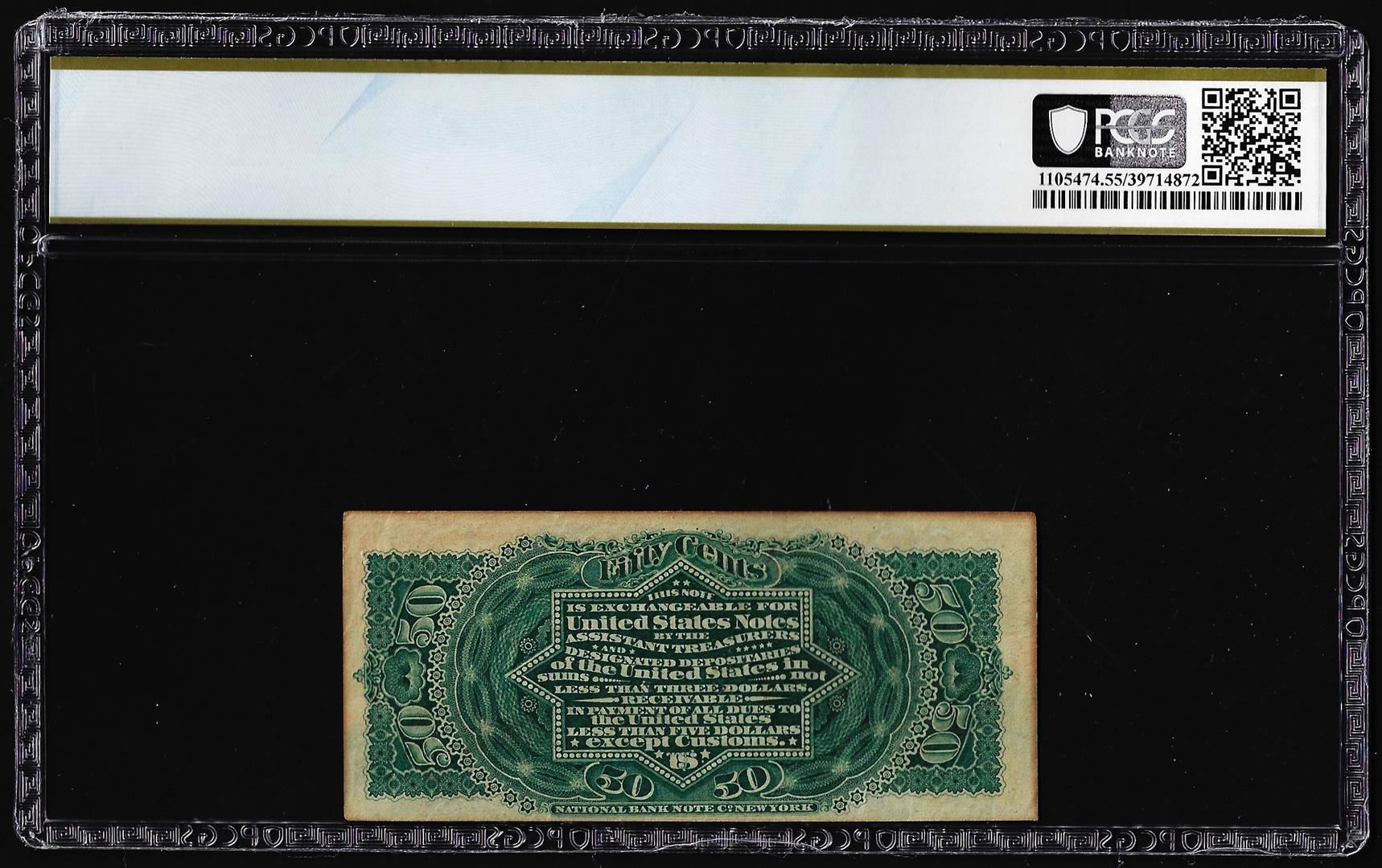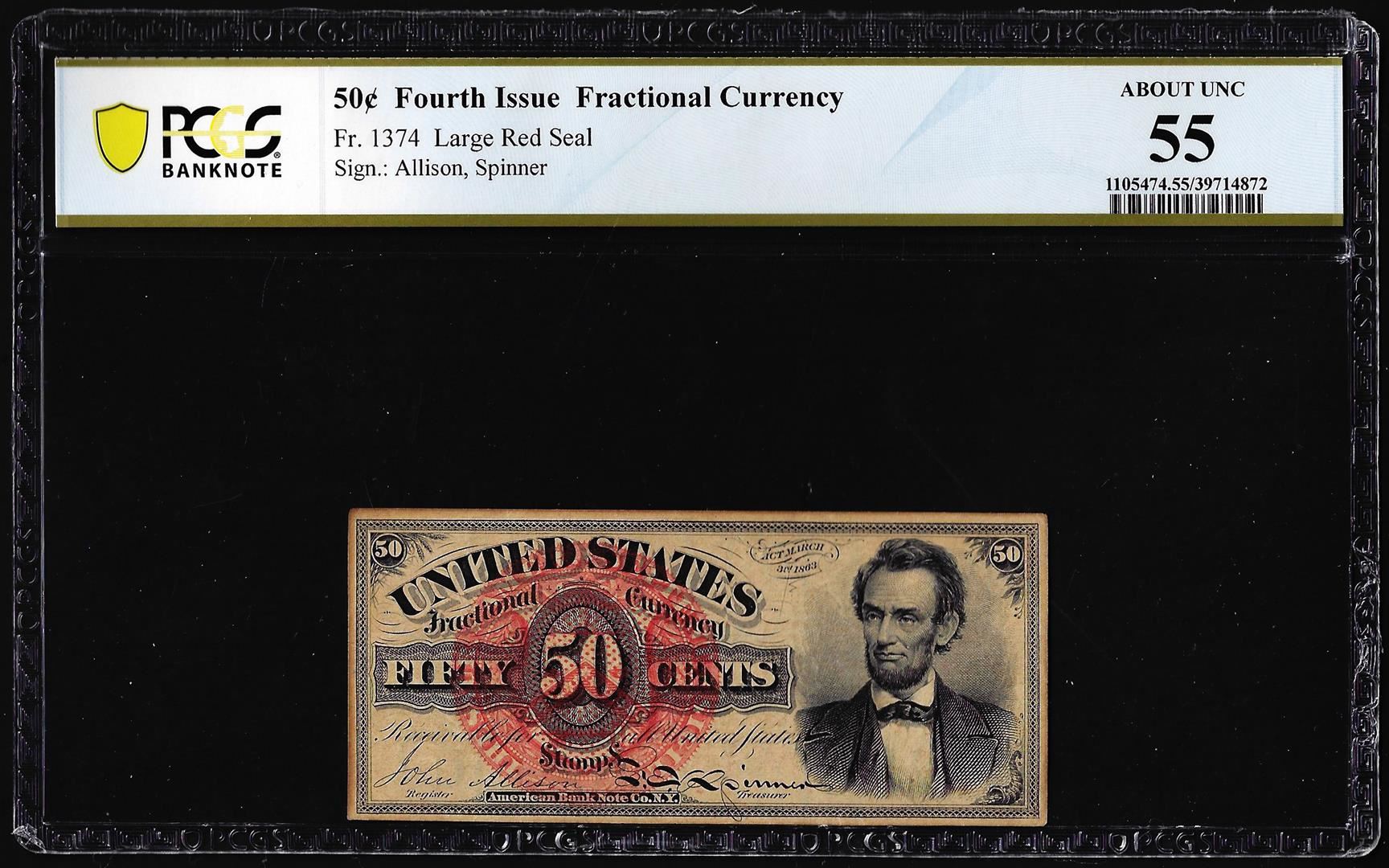 One 1863 Fourth Issue 50 Cent Lincoln Fractional Currency Note PCGS Uncirculated 55. PCGS Graded.
