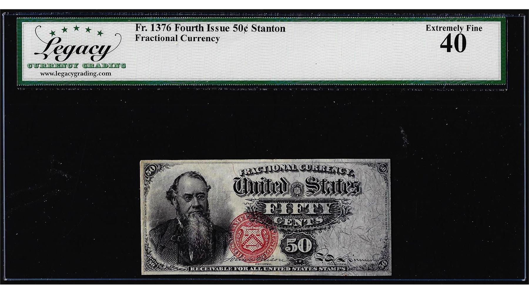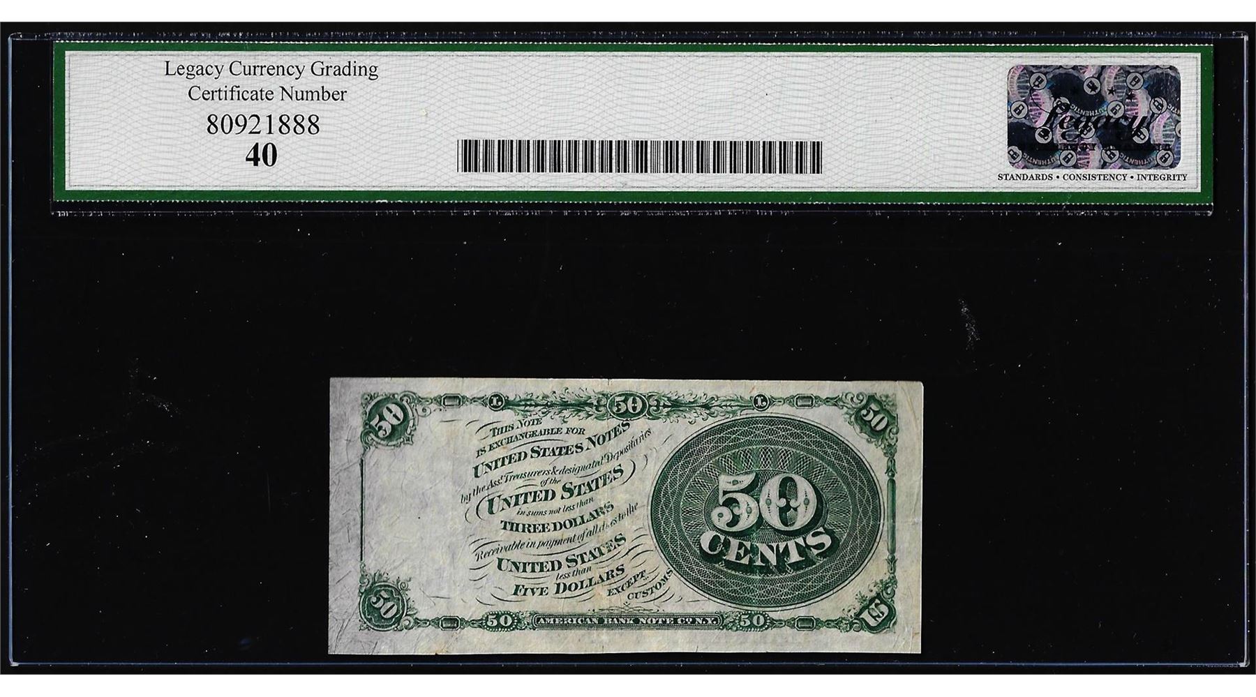 One 1863 Fourth Issue 50 Cents Fractional Currency Note Fr.1376 Legacy Extremely Fine 40. Legacy Graded.