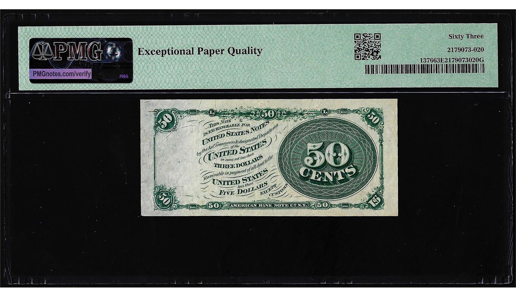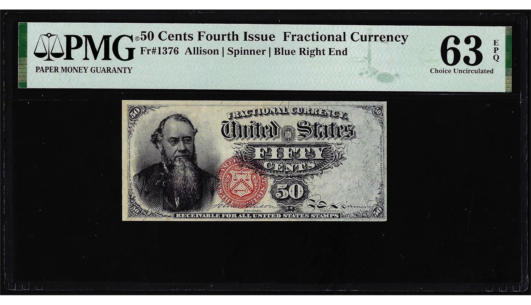 One 1863 Fourth Issue 50 Cents Fractional Currency Note Fr.1376 PMG Ch. Uncirculated 63EPQ. PMG Certified.