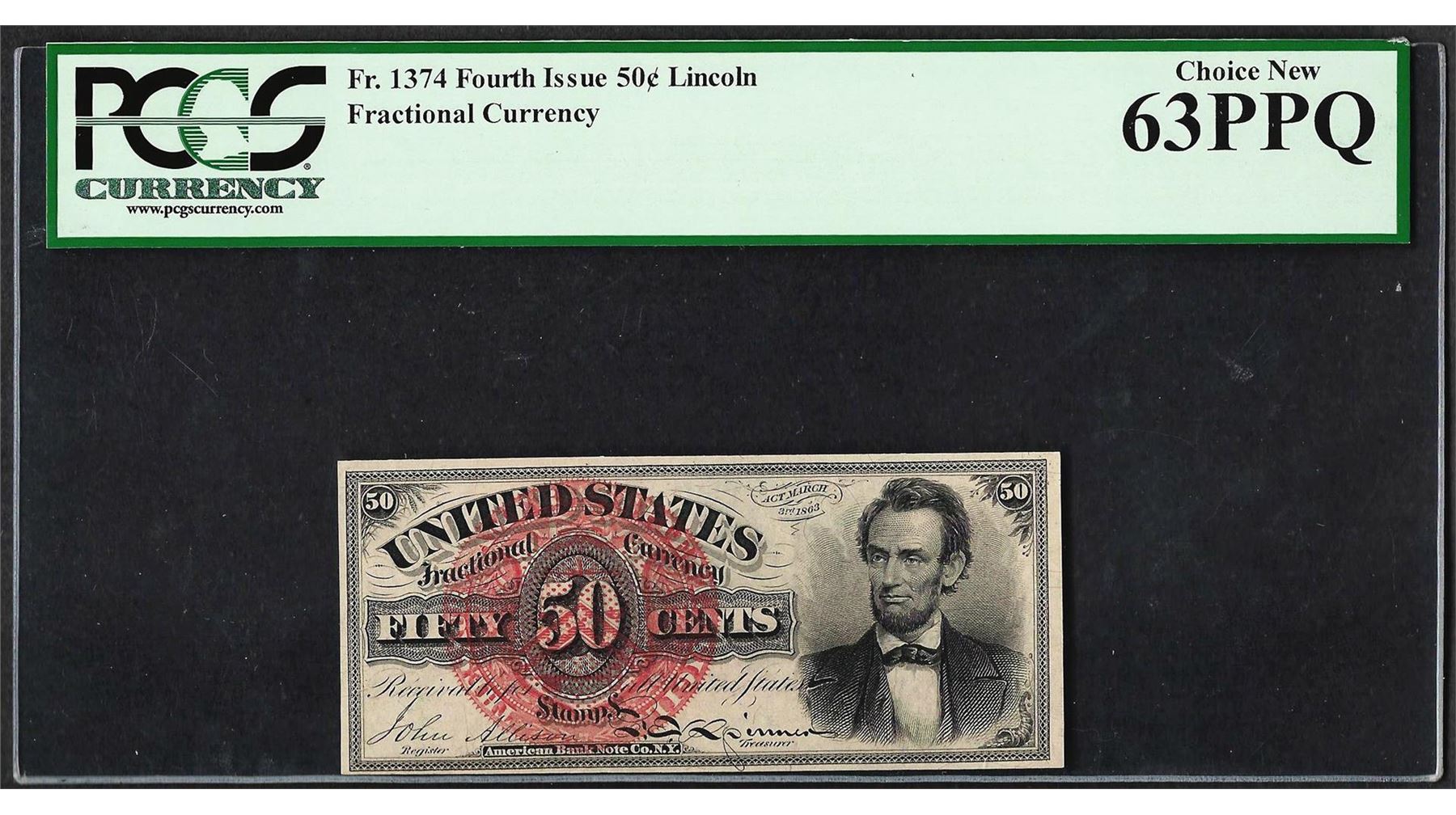 One 1863 Fourth Issue 50 Cents Fractional Currency Note PCGS Choice New 63PPQ. PCGS Graded.