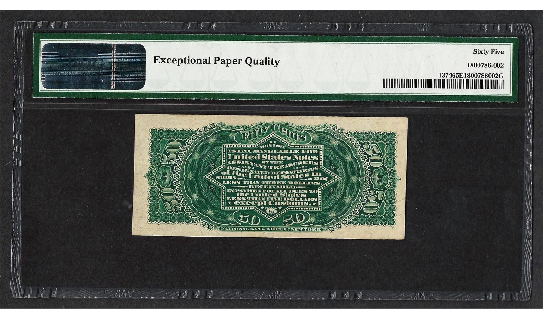One 1863 Fourth Issue 50 Cents Fractional Currency Note PMG Gem Uncirculated 65EPQ. PMG Certified.