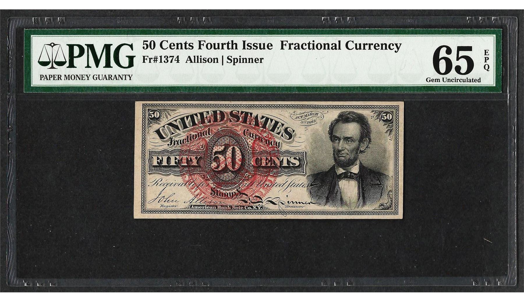 One 1863 Fourth Issue 50 Cents Fractional Currency Note PMG Gem Uncirculated 65EPQ. PMG Certified.
