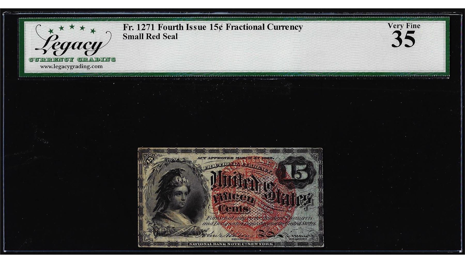 One 1863 Fourth Issue Fifteen Cents Fractional Currency Note Fr.1271 Legacy Very Fine 35. Legacy Graded.
