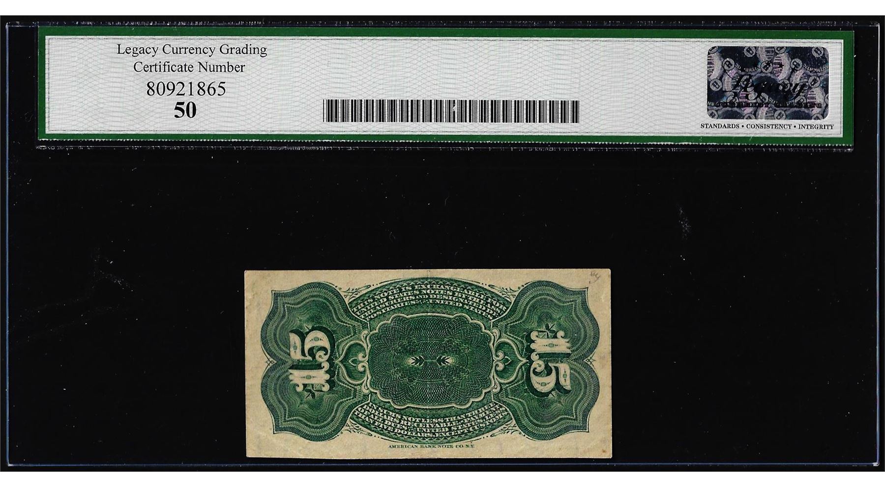 One 1863 Fourth Issue Fifteen Cents Fractional Note Fr.1267 Legacy About New 50. Legacy Graded.