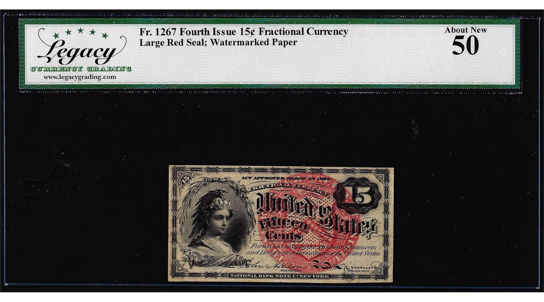 One 1863 Fourth Issue Fifteen Cents Fractional Note Fr.1267 Legacy About New 50. Legacy Graded.
