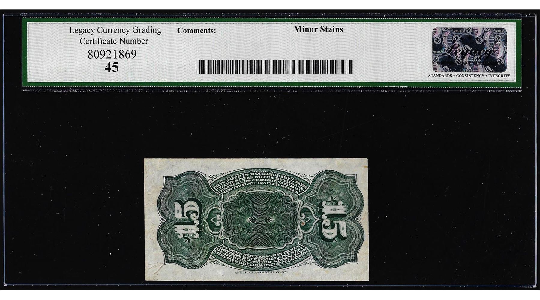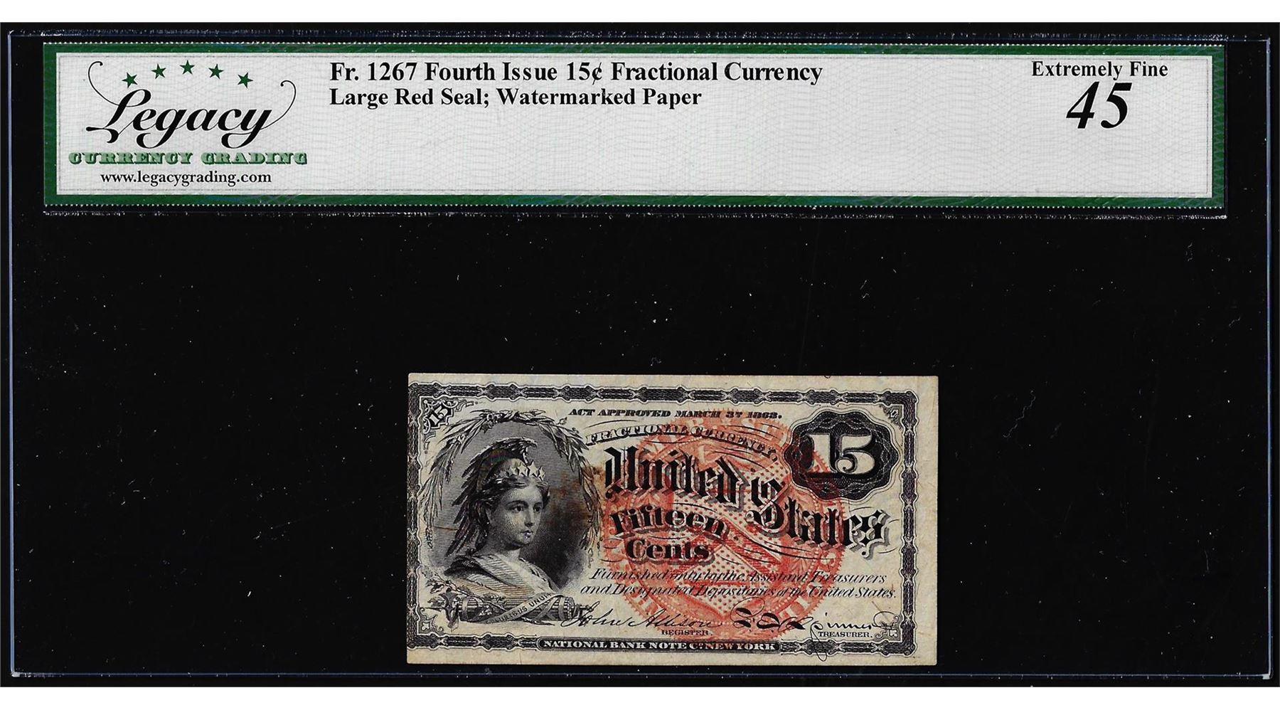 One 1863 Fourth Issue Fifteen Cents Fractional Note Fr.1267 Legacy Extremely Fine 45. Legacy Graded.