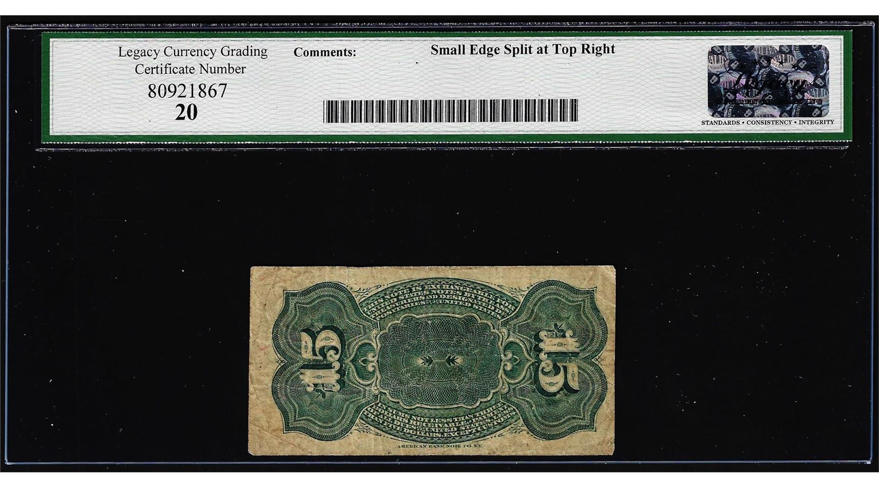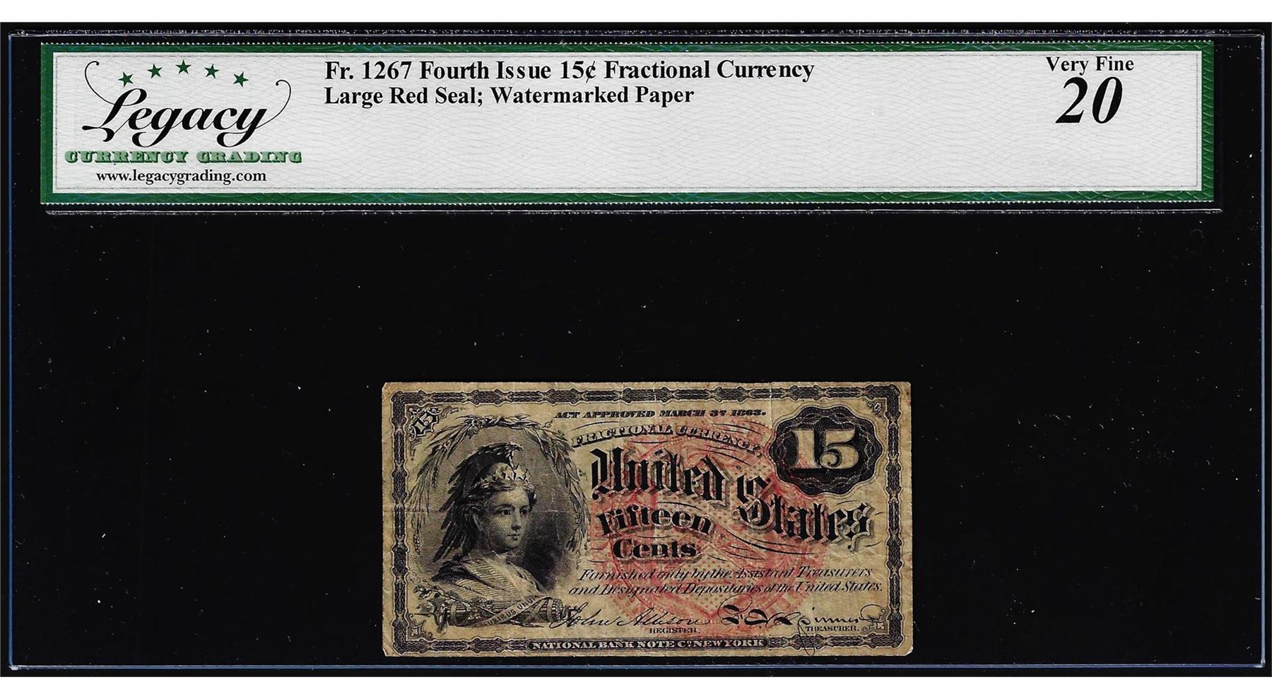 One 1863 Fourth Issue Fifteen Cents Fractional Note Fr.1267 Legacy Very Fine 20. Legacy Graded.