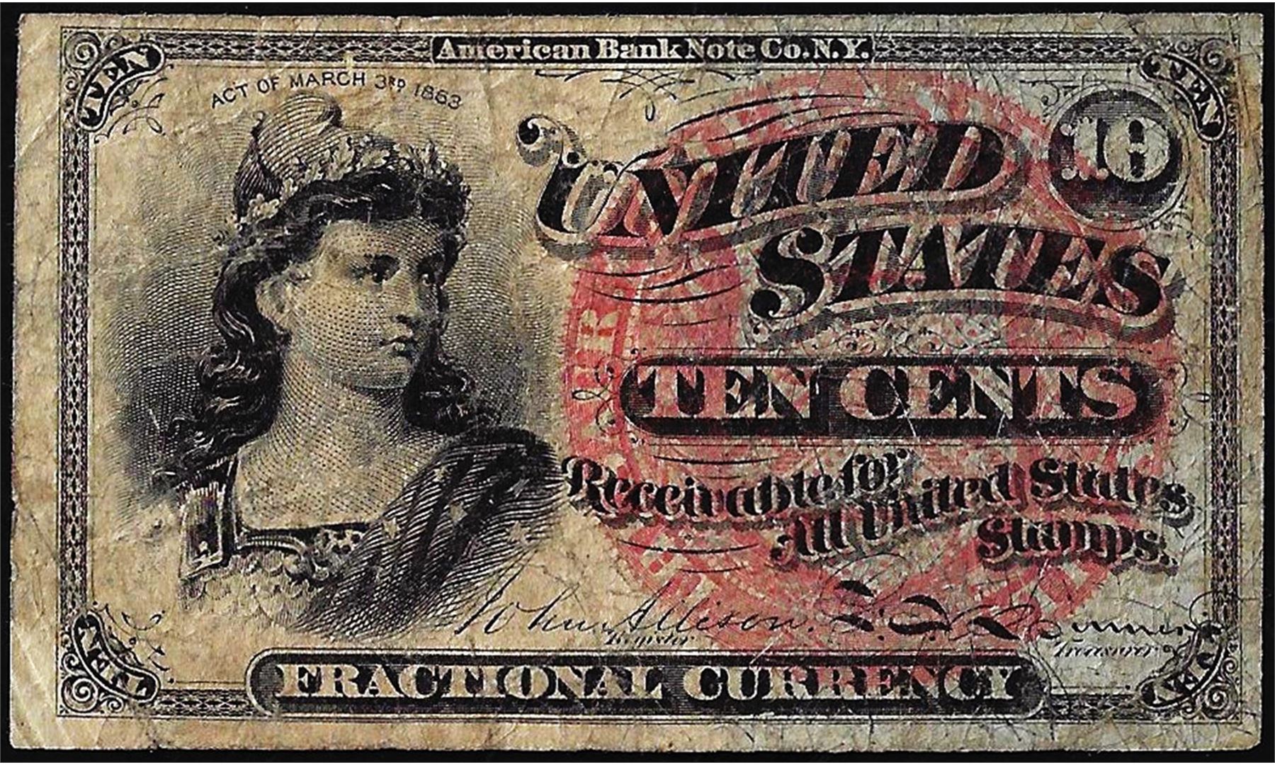 One 1863 Fourth Issue Ten Cents Fractional Currency Note.