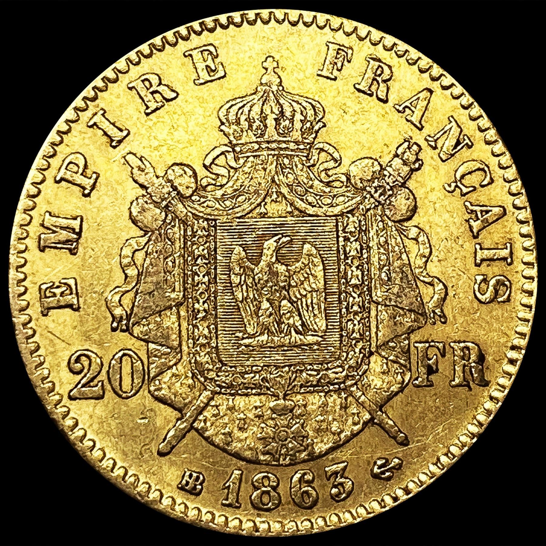 1863 France .1867oz Gold 20 Francs CLOSELY UNCIRCU