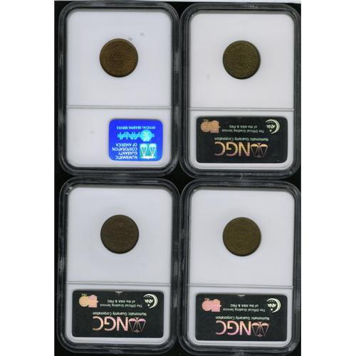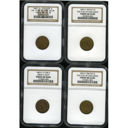 <B>1863 Group Lot of Four NGC-Certified Patriotic Civil War Tokens.</B></I> The lot consists of: a <B>Fuld-203/412b, AU55 Brown NGC; Fuld-206/323a, MS62 Brown NGC; Fuld-210/408a, MS63 Red and Brown NGC;</B></I> and a <B>Fuld-11/298a, AU58.</B></I> A personal inspection is suggested.<BR><I>From The Troy Wiseman Collection.</B></I>