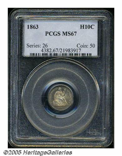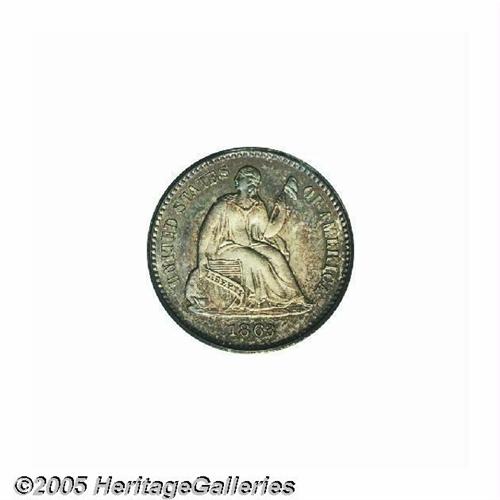 <B>1863<H10C> MS67 PCGS.</B></I> Medium golden-brown and apple-green colors fill the obverse and frame the untoned reverse center. A pinpoint-sharp Superb Gem, lustrous and magnificently preserved. Only 18,000 pieces were struck, since silver coins were hoarded during the Civil War. The 1 in the date is boldly repunched south. Population: 15 in 67, 2 finer (6/05).