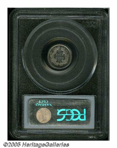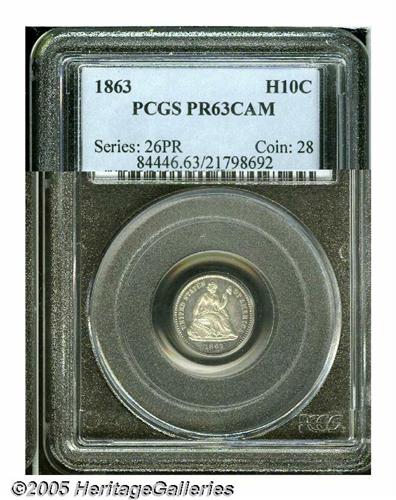 <B>1863<H10C> PR63 Cameo PCGS.</B></I> The 1 and 8 in the date are both repunched, a characteristic often seen on this proof issue. Mostly brilliant with a little mottled gray color. Scattered hairlines serve to limit the grade.