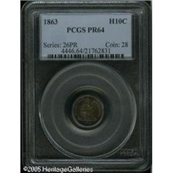 <B>1863 H10C PR64 PCGS.</B></I> Deep russet patina embraces this crisply struck and lovingly preserved near-Gem. The 1 in the date is sharply repunched. Only 18,000 business strikes were issued, and many collectors instead select one of the 460 proofs that were produced. Population: 60 in 64, 40 finer (1/05). Lot:6162