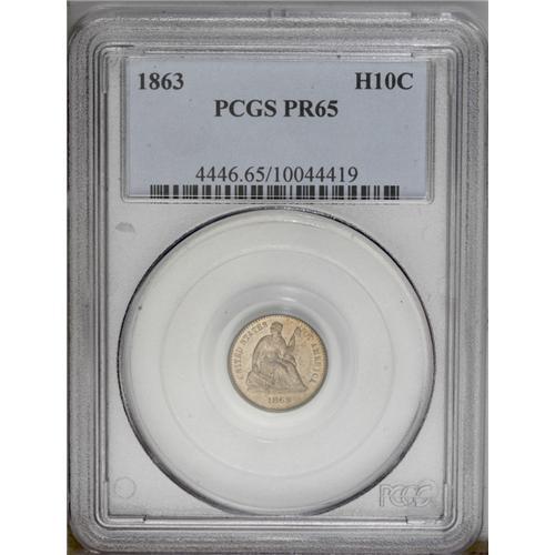 <B>1863<H10C> PR65 PCGS.</B></I> Light tan-gold surfaces display cameo tendencies between frosted motifs and reflective fields when the coin is rotated beneath a light source. Its overall eye appeal is enhanced by sharply struck design elements and the absence of significant contact marks. Population: 33 in 65, 9 finer (4/06).